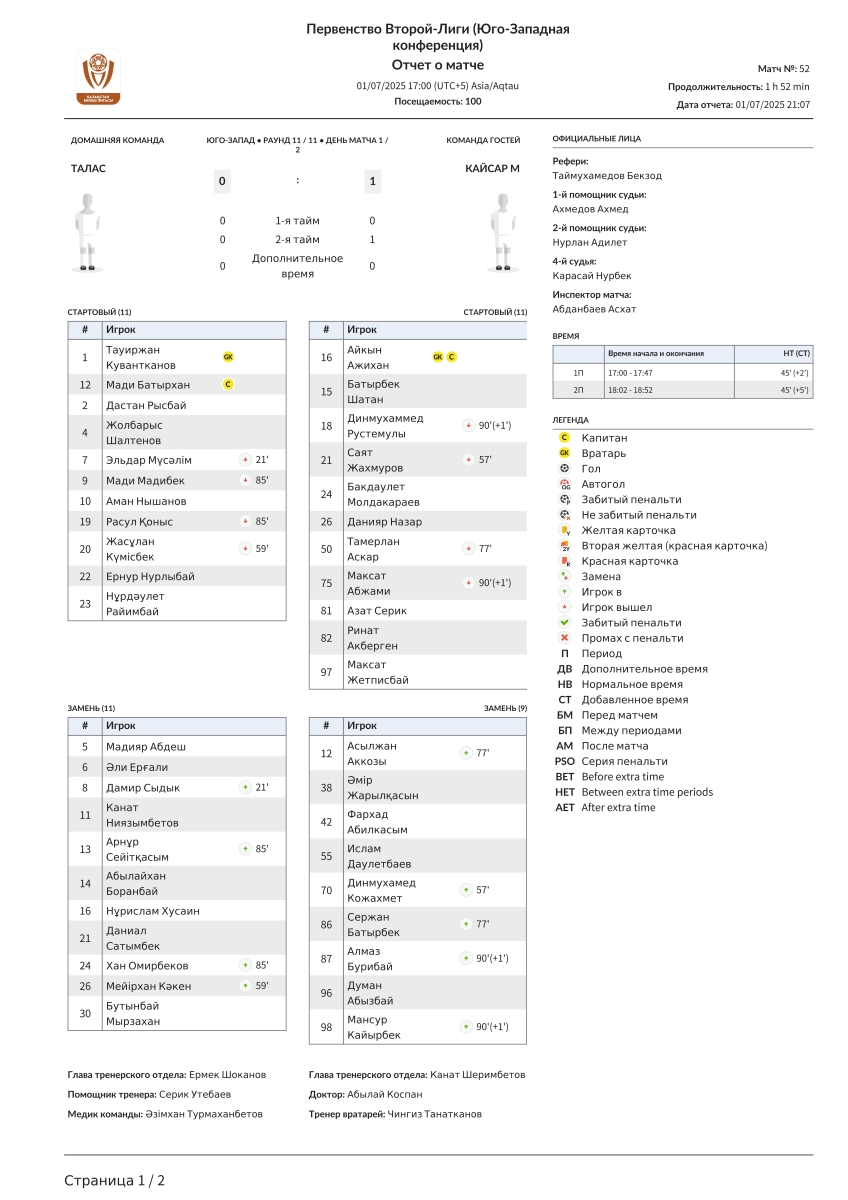 «Талас» Каратау - «Кайсар-М» Кзыл-Орда - 0:1
