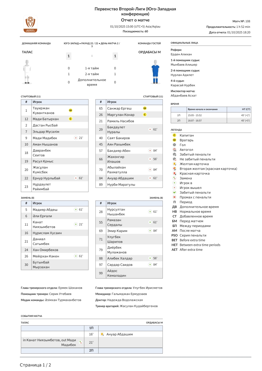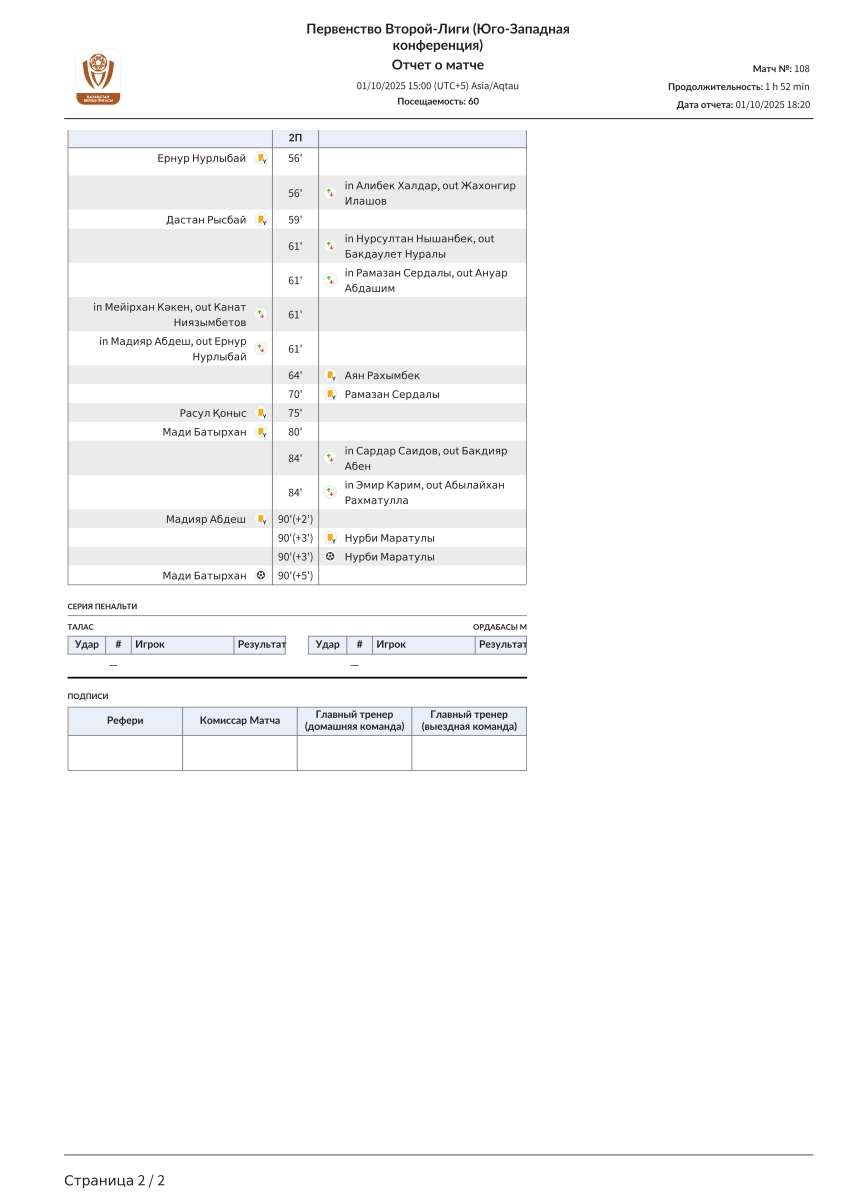 «Талас» Каратау - «Ордабасы U-21» Чимкент - 1:1