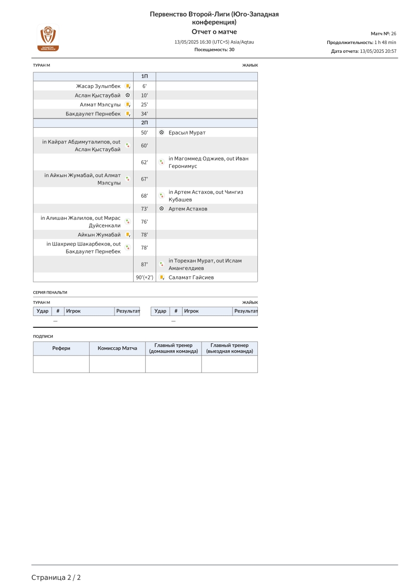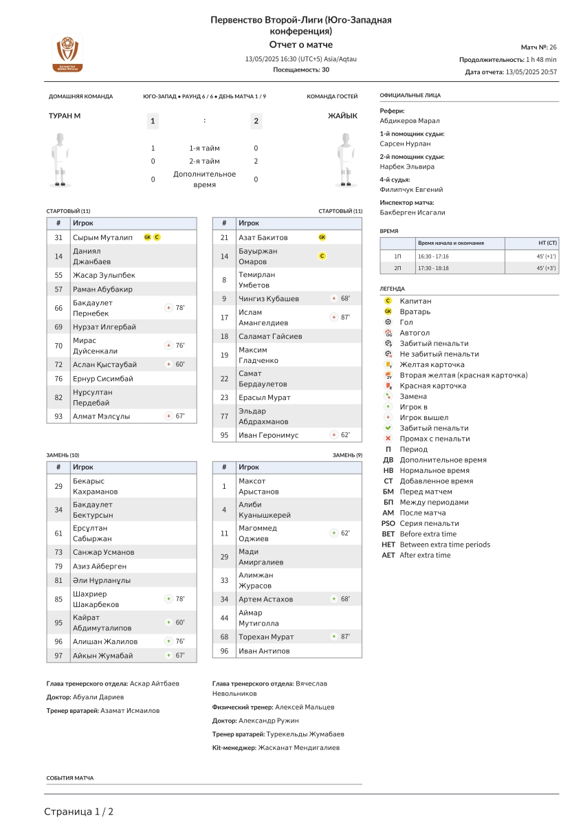 «Туран-М» Туркестан - «Жайык» Уральск - 1:2