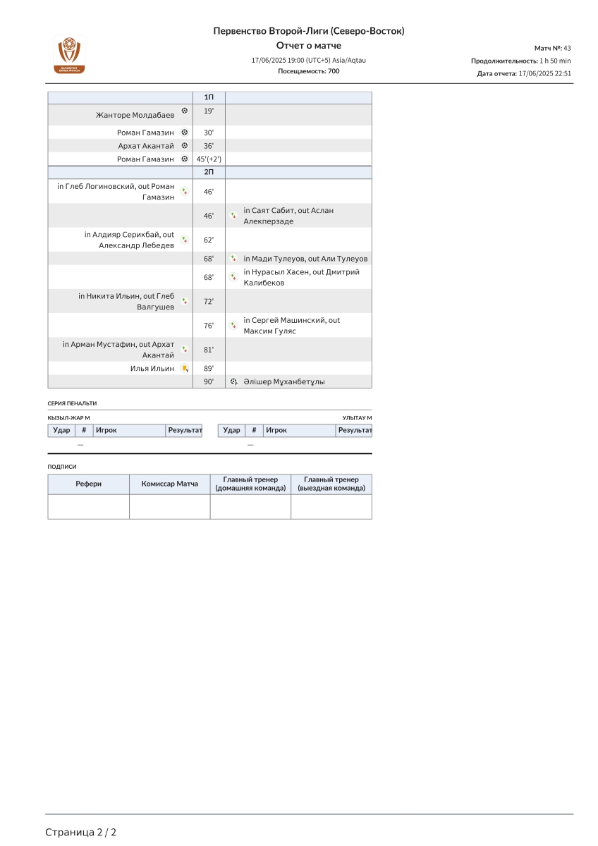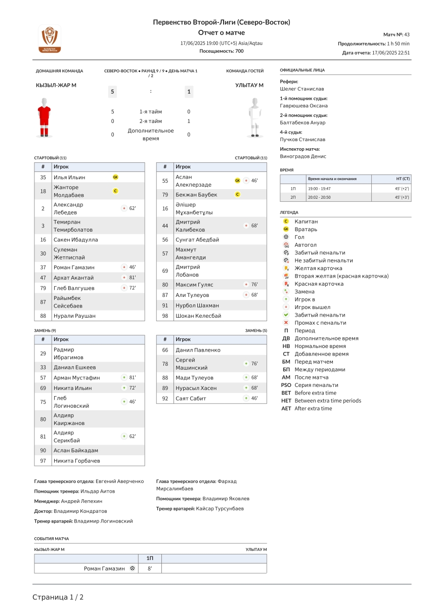 «Кызыл-Жар СК-М» Петропавловск - «Улытау-М» Джезказган - 5:1