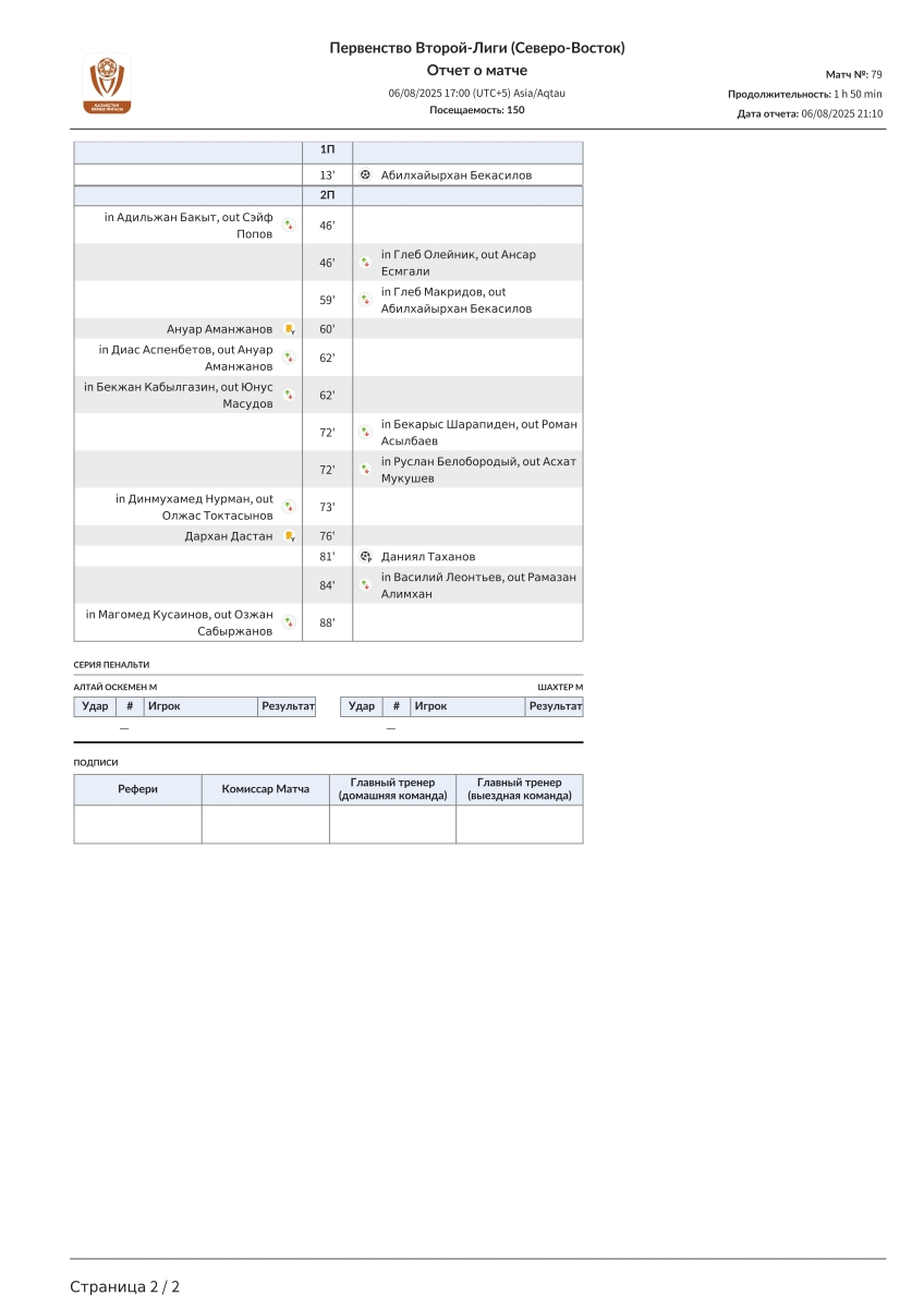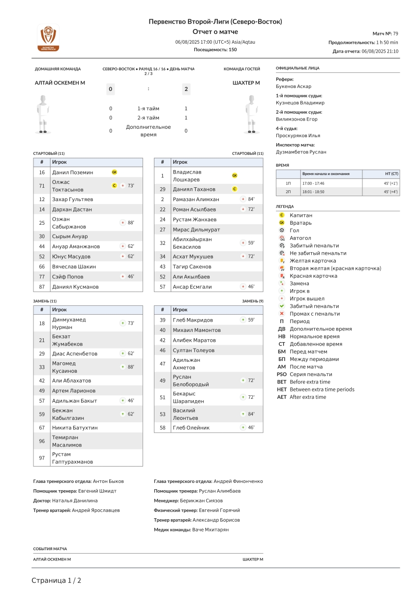 «Алтай-М» Усть-Каменогорск - «Шахтёр U-21» Караганда - 0:2
