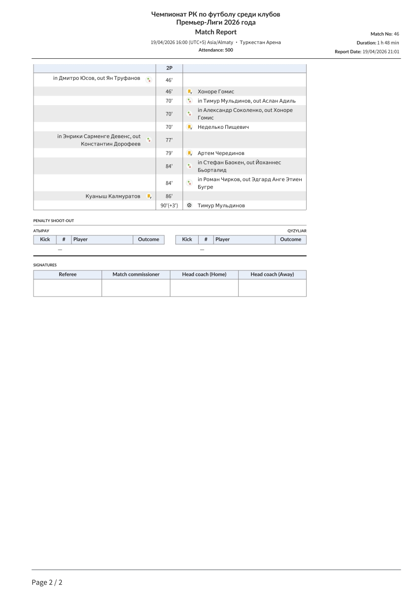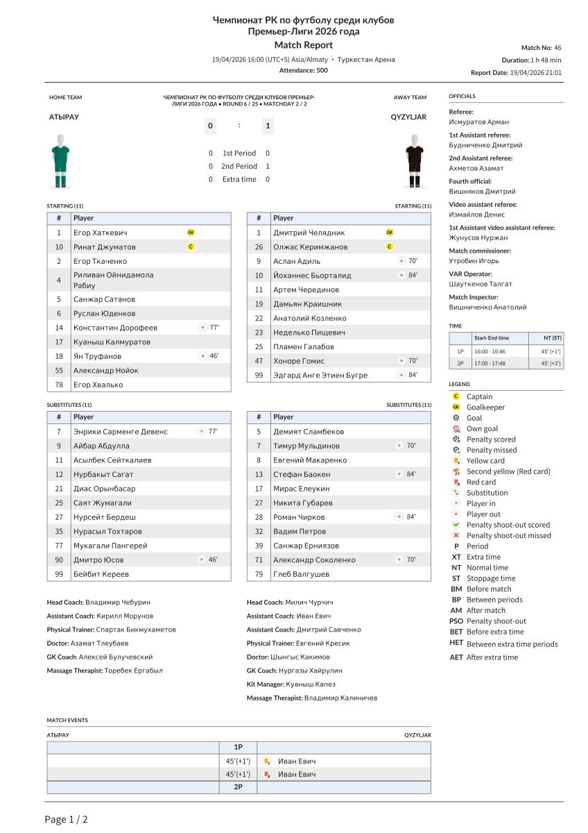 «Атырау» Атырау - «Кызыл-Жар СК» Петропавловск - 0:1