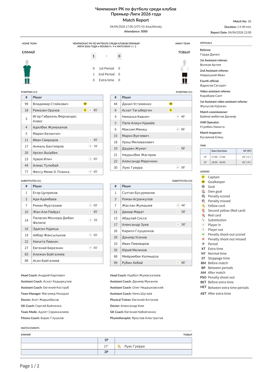 «Елимай» Семей - «Тобол» Кустанай - 1:0