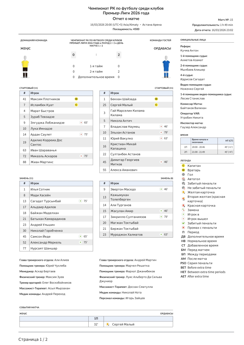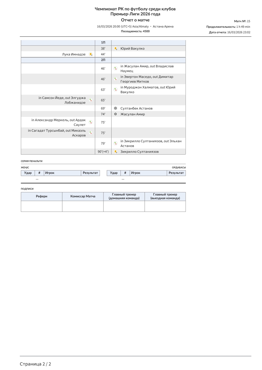 «Женис» Астана - «Ордабасы» Чимкент - 0:2