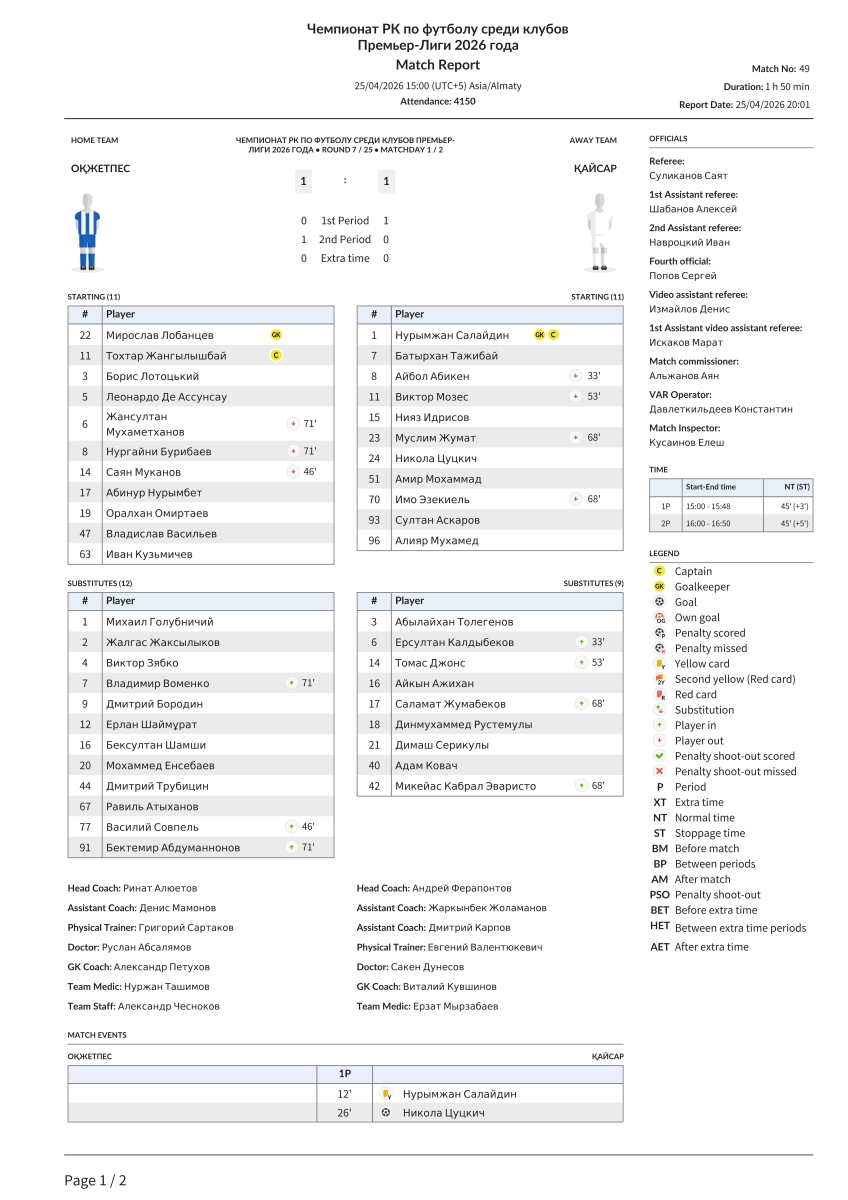 «Окжетпес» Кокчетав - «Кайсар» Кзыл-Орда - 1:1
