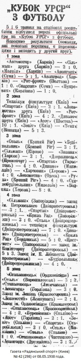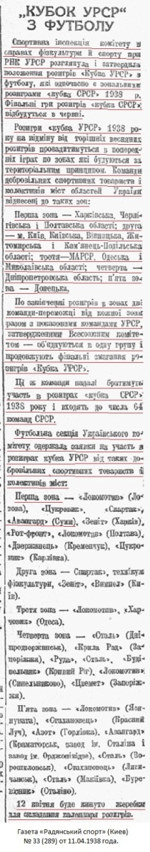 Спортивная инспекция комитета по делам физкультуры и спорта при СНК УССР рассмотрела и утвердила положение розыгрыша «Кубка УССР» по футболу, который одновременно является зональным розыгрышем «кубка СССР» 1938 г. Финальные игры розыгрыша «кубка СССР» состоятся в июне.