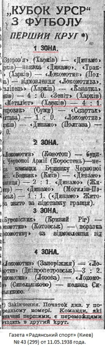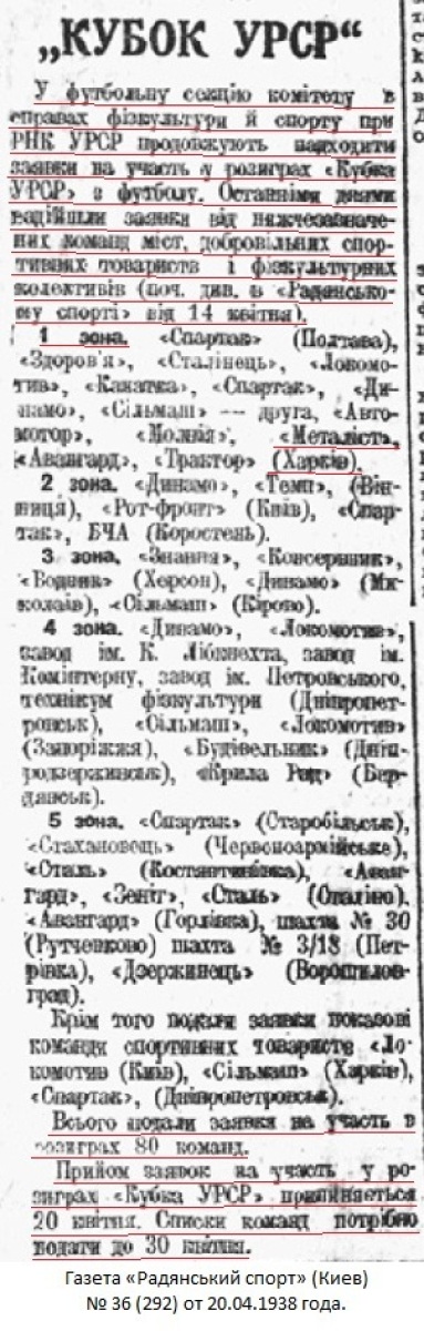 Спортивная инспекция комитета по делам физкультуры и спорта при СНК УССР рассмотрела и утвердила положение розыгрыша «Кубка УССР» по футболу, который одновременно является зональным розыгрышем «кубка СССР» 1938 г. Финальные игры розыгрыша «кубка СССР» состоятся в июне.