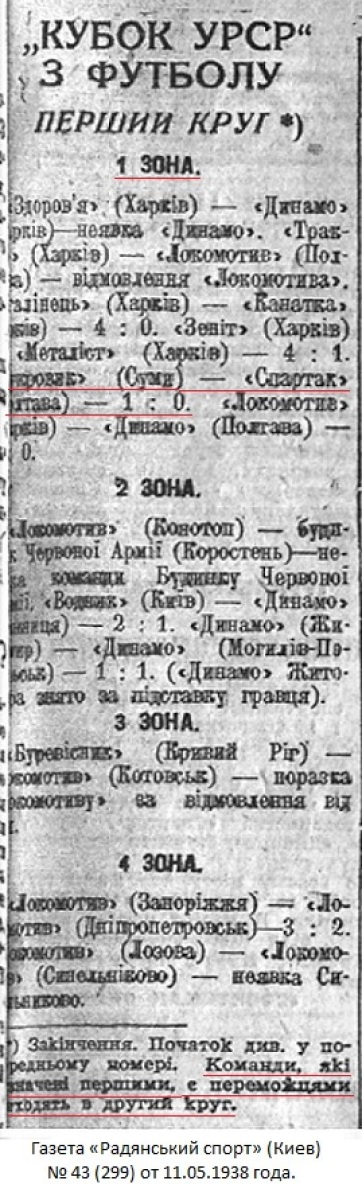 Спортивная инспекция комитета по делам физкультуры и спорта при СНК УССР рассмотрела и утвердила положение розыгрыша «Кубка УССР» по футболу, который одновременно является зональным розыгрышем «кубка СССР» 1938 г. Финальные игры розыгрыша «кубка СССР» состоятся в июне.