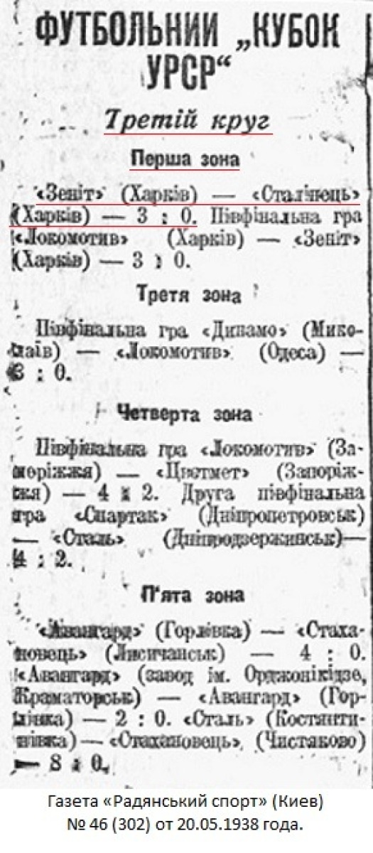 Вчера на стадионе «Зенит» состоялся интересный футбольный матч между харьковскими командами «Зенит» и «Сталинец» на «Кубок УССР». Матч закончился победой зенитовцев, забивших три мяча. На матче присутствовало до 5.000 зрителей.