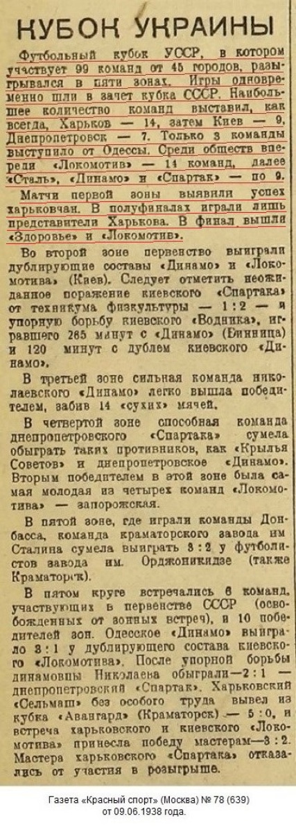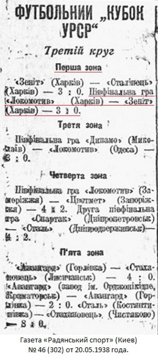 Комментарий. Команда «Локомотив» (Харьков), войдя в число двух команд-победителей групп 14-й зоны (Харьков) розыгрыша Кубка СССР 1938 года, завоевала право участия в финальной части розыгрыша Кубка СССР (1/32 финала - финал).