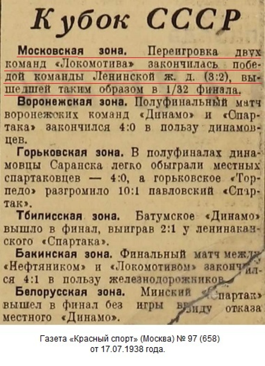 Комментарий. Команда «Локомотив-2» (Москва), войдя в число четырех команд-победителей 1-й зоны (Москва) 1-й группы розыгрыша Кубка СССР 1938 года, завоевала право участия в финальной части розыгрыша Кубка СССР (1/32 финала - финал).