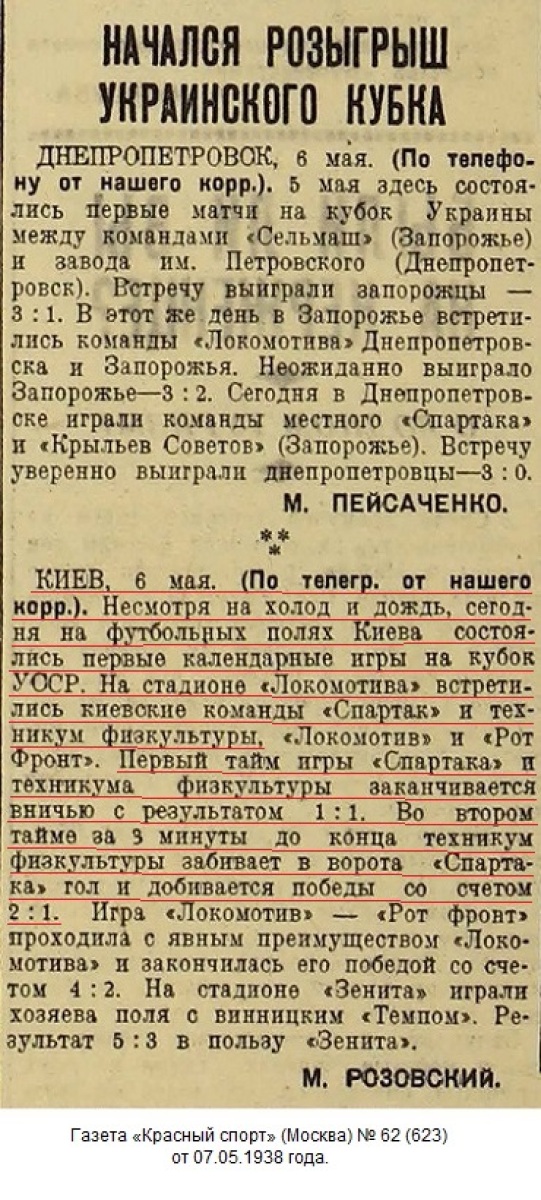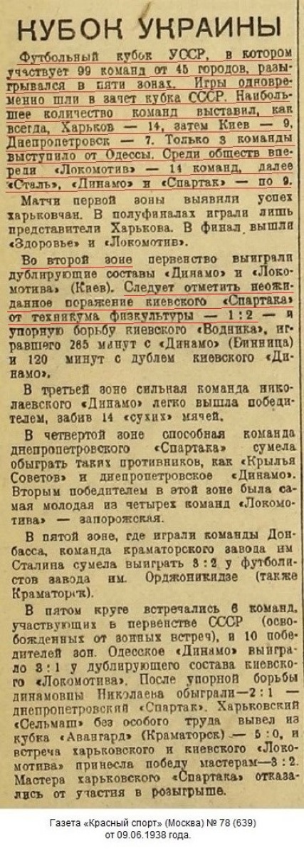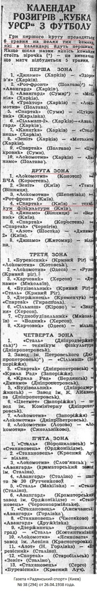 Спортивная инспекция комитета по делам физкультуры и спорта при СНК УССР рассмотрела и утвердила положение розыгрыша «Кубка УССР» по футболу, который одновременно является зональным розыгрышем «кубка СССР» 1938 г. Финальные игры розыгрыша «кубка СССР» состоятся в июне.