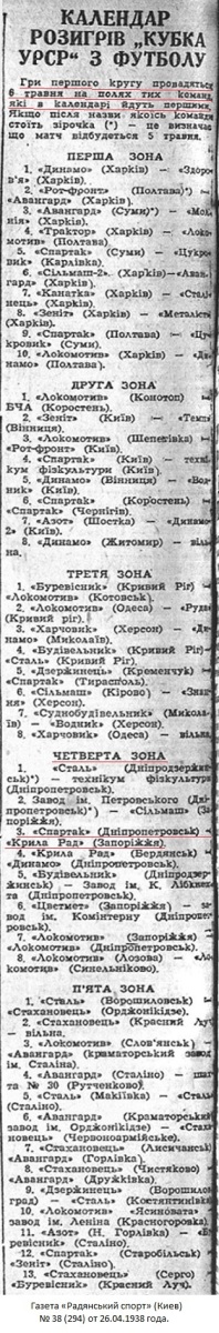 Спортивная инспекция комитета по делам физкультуры и спорта при СНК УССР рассмотрела и утвердила положение розыгрыша «Кубка УССР» по футболу, который одновременно является зональным розыгрышем «кубка СССР» 1938 г. Финальные игры розыгрыша «кубка СССР» состоятся в июне.