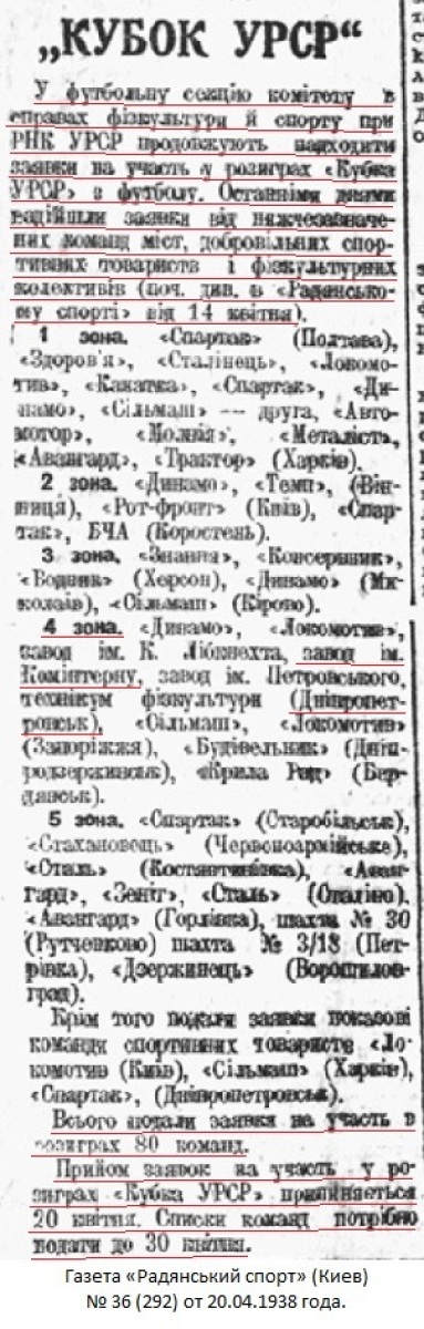 Спортивная инспекция комитета по делам физкультуры и спорта при СНК УССР рассмотрела и утвердила положение розыгрыша «Кубка УССР» по футболу, который одновременно является зональным розыгрышем «кубка СССР» 1938 г. Финальные игры розыгрыша «кубка СССР» состоятся в июне.