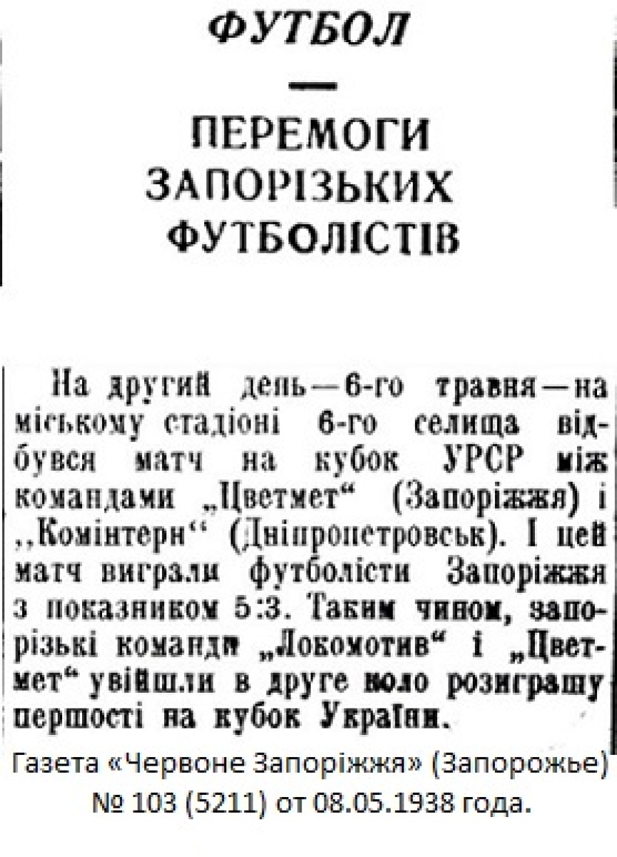 ...На второй день – 6-го мая – на городском стадионе 6-го поселка состоялся матч на кубок УССР между командами «Цветмет» (Запорожье) и «Коминтерн» (Днепропетровск). И этот матч выиграли футболисты Запорожья с показателем 5:3. Таким образом, запорожские команды «Локомотив» и «Цветмет» вошли во второй круг розыгрыша первенства на кубок Украины.