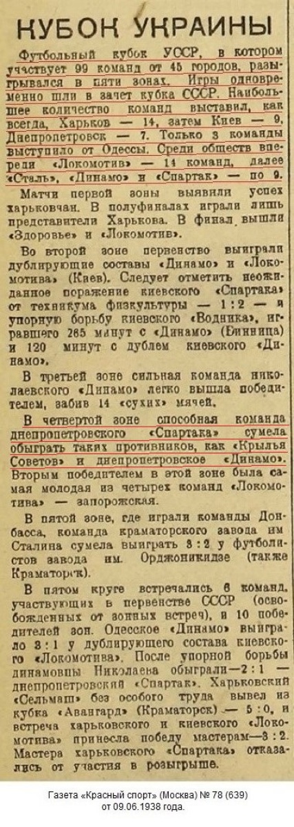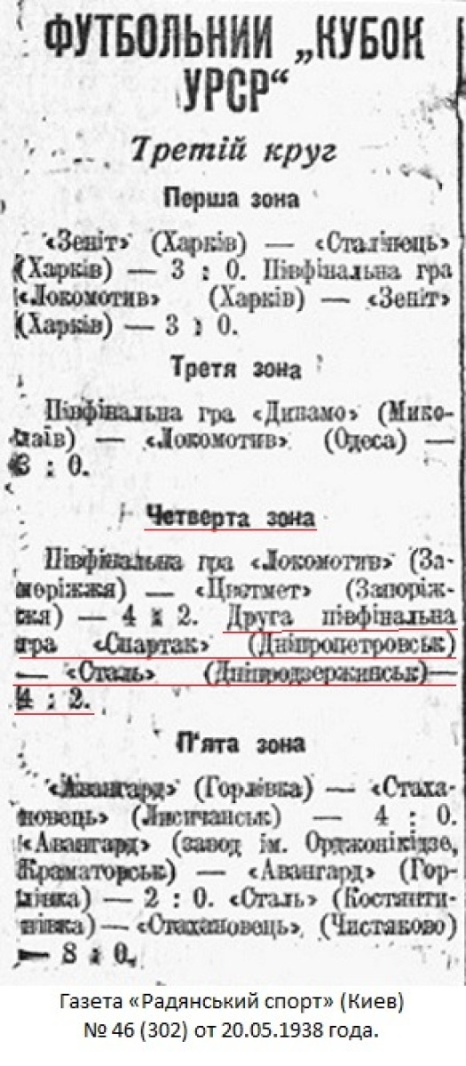 Комментарий. Команда «Спартак» (Днепропетровск), войдя в число двух команд-победителей групп 17-й зоны (Днепропетровск) розыгрыша Кубка СССР 1938 года, завоевала право участия в финальной части розыгрыша Кубка СССР (1/32 финала - финал).