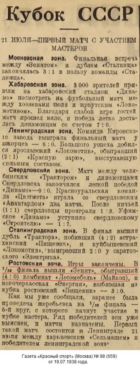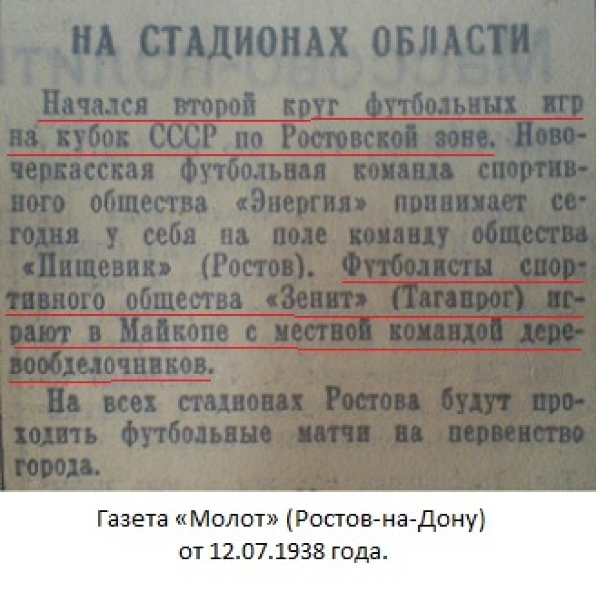 Комментарий. Команда «Зенит» (Таганрог), войдя в число двух команд-победителей групп 9-й зоны (Ростов-на-Дону) розыгрыша Кубка СССР 1938 года, завоевала право участия в финальной части розыгрыша Кубка СССР (1/32 финала - финал).