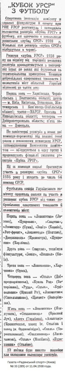 Спортивная инспекция комитета по делам физкультуры и спорта при СНК УССР рассмотрела и утвердила положение розыгрыша «Кубка УССР» по футболу, который одновременно является зональным розыгрышем «кубка СССР» 1938 г. Финальные игры розыгрыша «кубка СССР» состоятся в июне.
