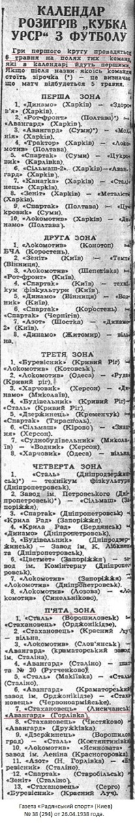 Спортивная инспекция комитета по делам физкультуры и спорта при СНК УССР рассмотрела и утвердила положение розыгрыша «Кубка УССР» по футболу, который одновременно является зональным розыгрышем «кубка СССР» 1938 г. Финальные игры розыгрыша «кубка СССР» состоятся в июне.