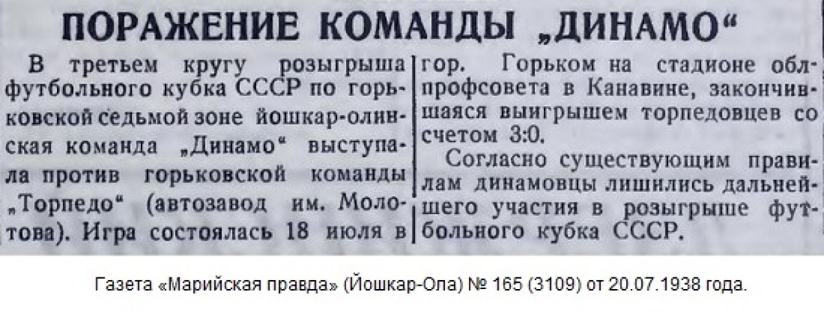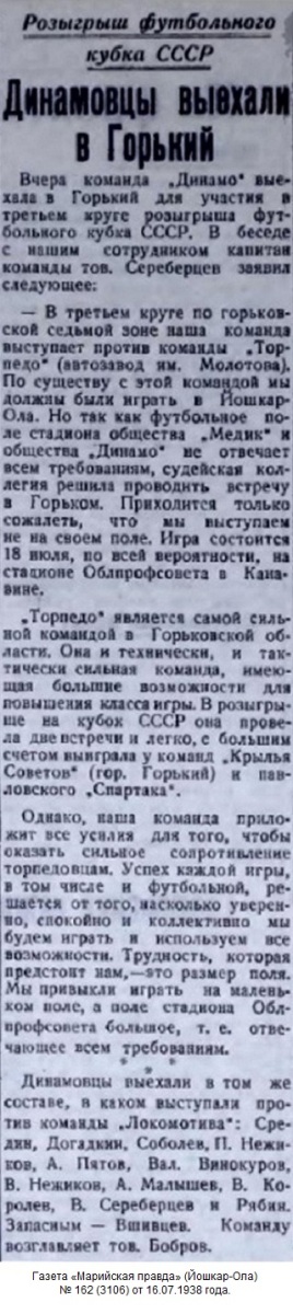 Комментарий 2. Команда «Торпедо» (Горький), войдя в число двух команд-победителей групп 7-й зоны (Горький) розыгрыша Кубка СССР 1938 года, завоевала право участия в финальной части розыгрыша Кубка СССР (1/32 финала - финал).