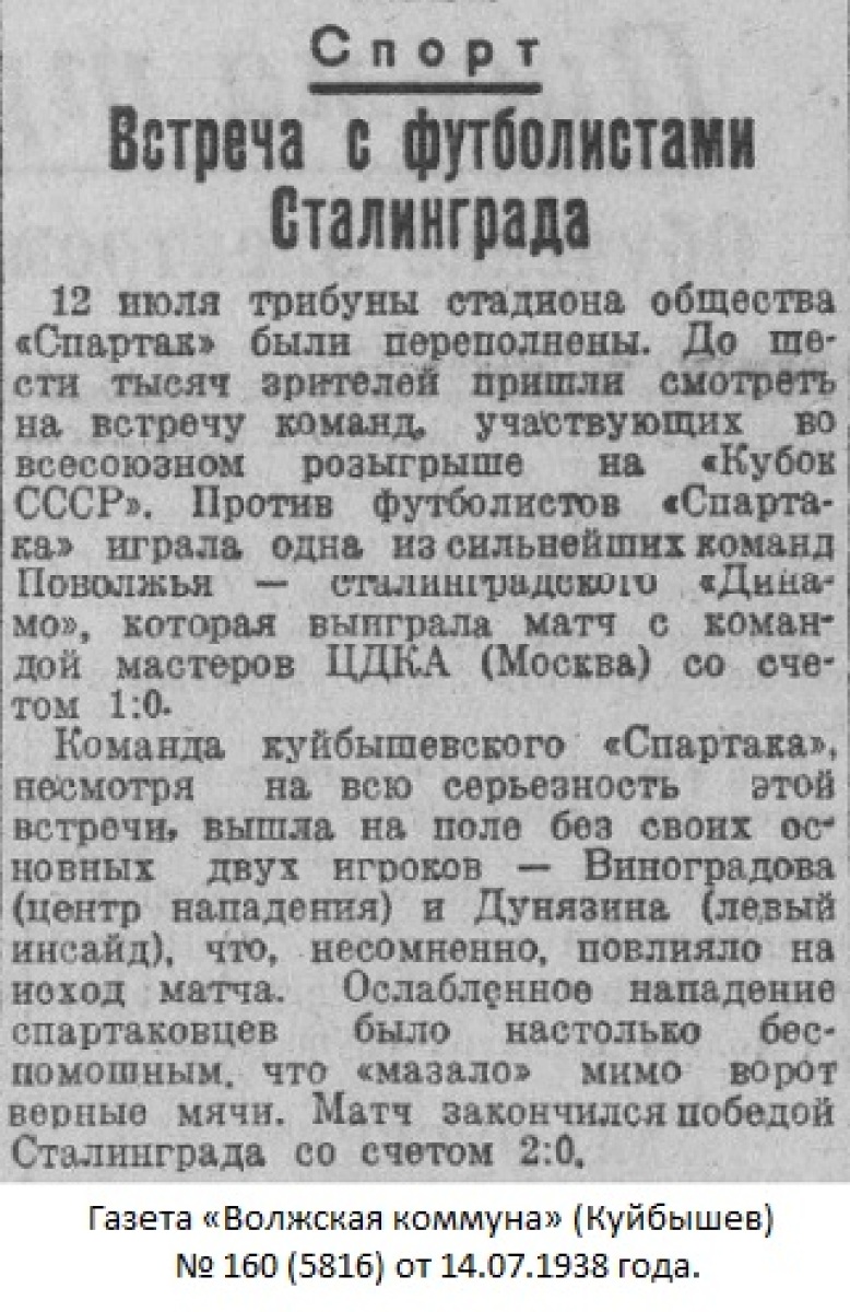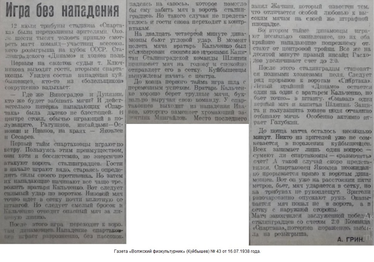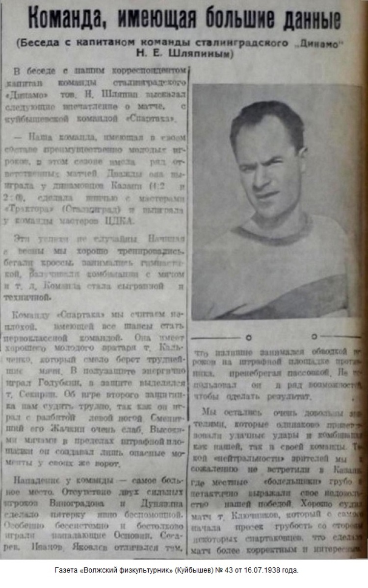 Комментарий. Команда «Динамо» (Сталинград) была усилена. В частности, Георгием Шляпиным, игравшим в тот же период времени в команде «Трактор» (Сталинград).