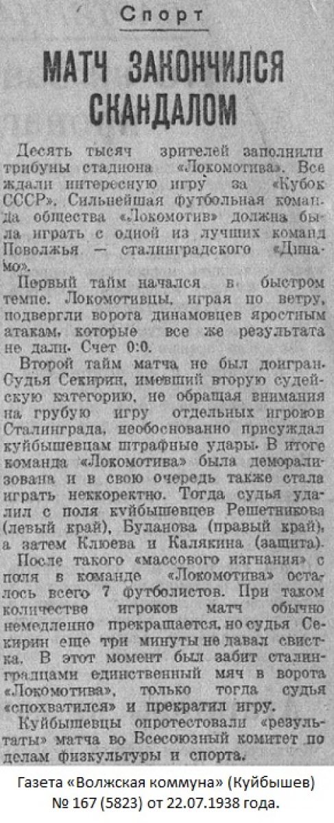 На 85-й минуте при счете 0:1 судья остановил игру и увел команды с поля, т. к. в команде «Локомотив» (Куйбышев) на поле осталось 7 игроков. «Локомотив» подал протест, но он был отклонен. Команде «Локомотив» (Куйбышев) присуждено техническое поражение.