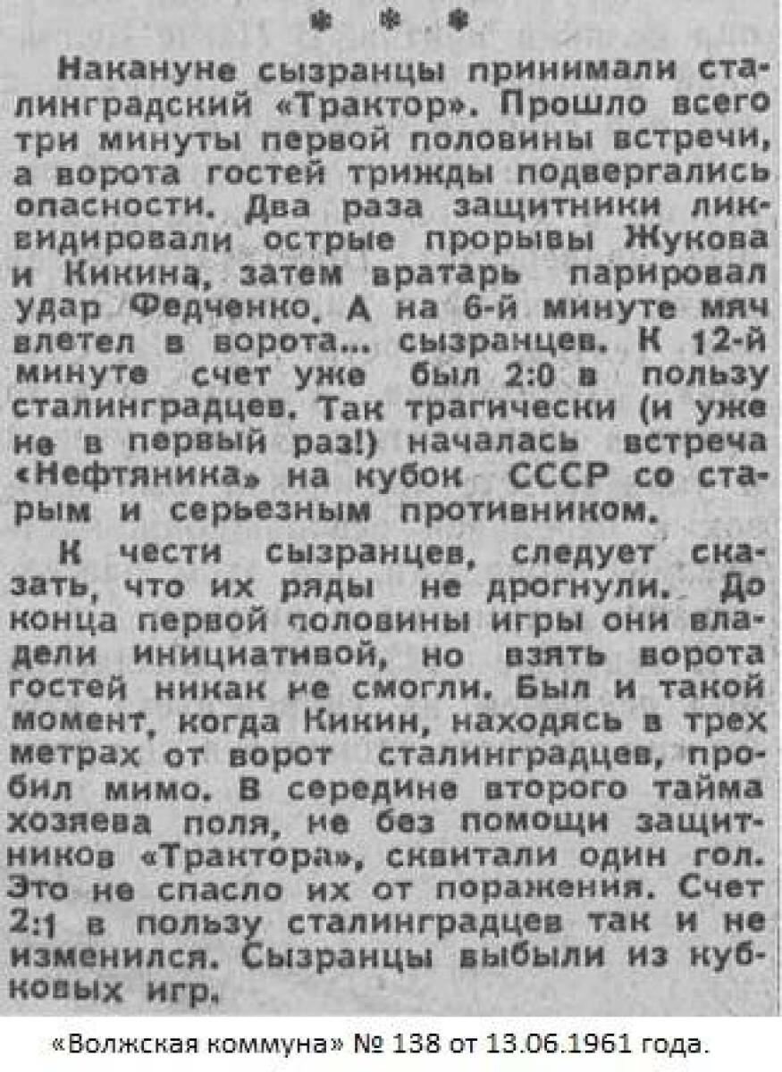 «Нефтяник» Сызрань - «Трактор» Сталинград - 1:2