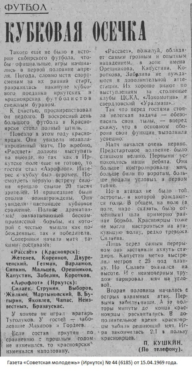 «Рассвет» Красноярск - «Аэрофлот» Иркутск - 2:1