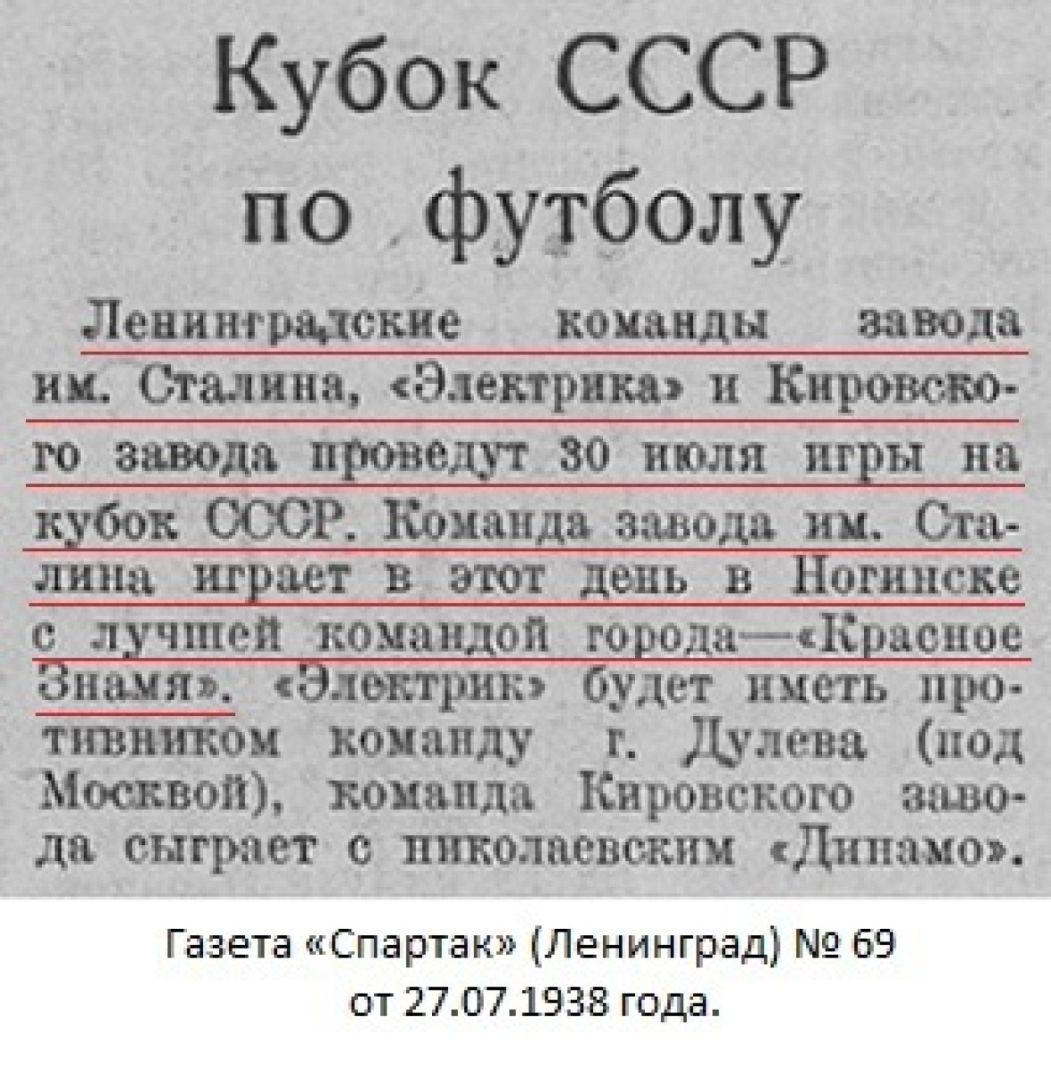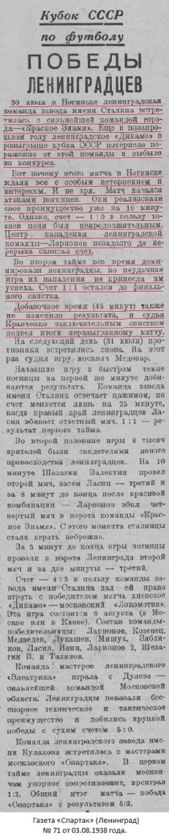 30 июля на глуховском стадионе общества «Красное знамя» состоялся футбольный матч на розыгрыш кубка СССР по 4-му кругу между командами: «Красное знамя» (Глухово) и «Сталинец» (Ленинград).