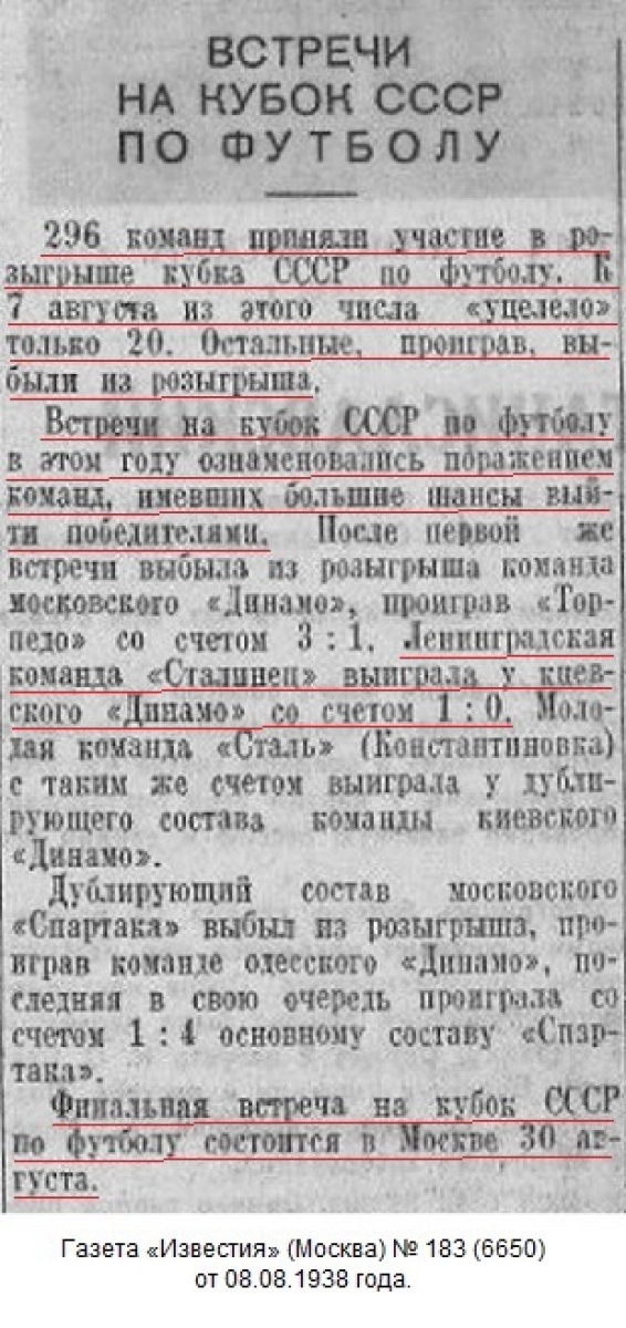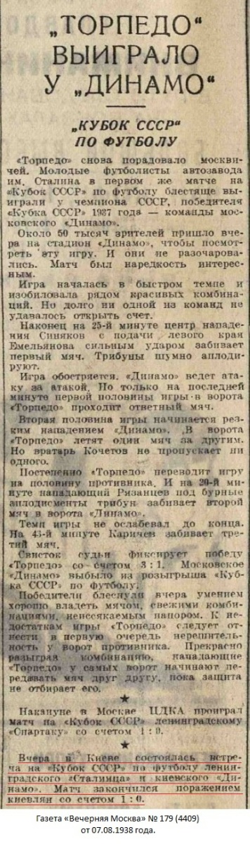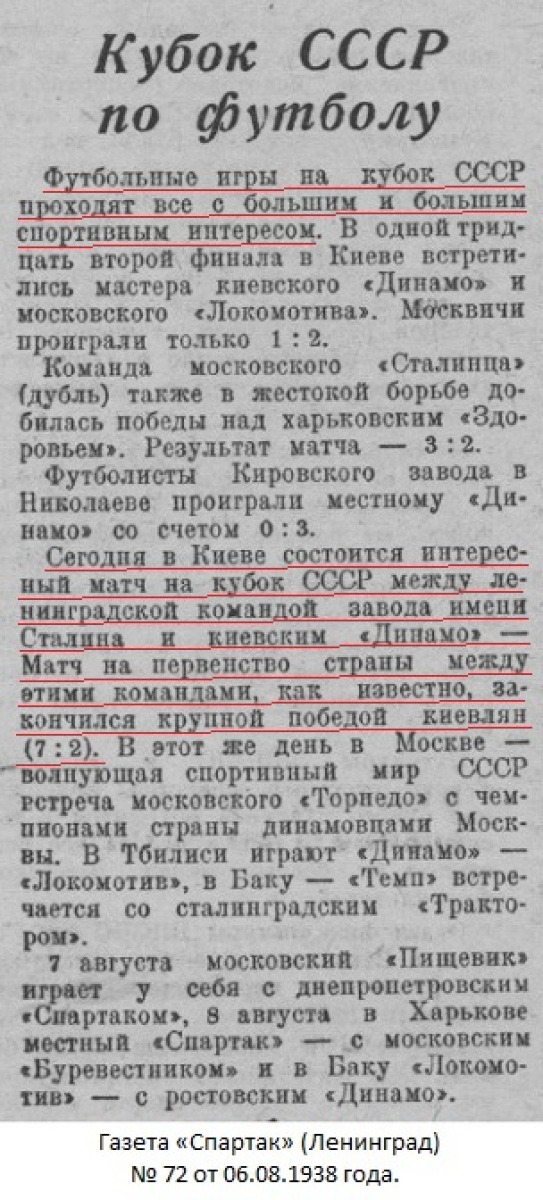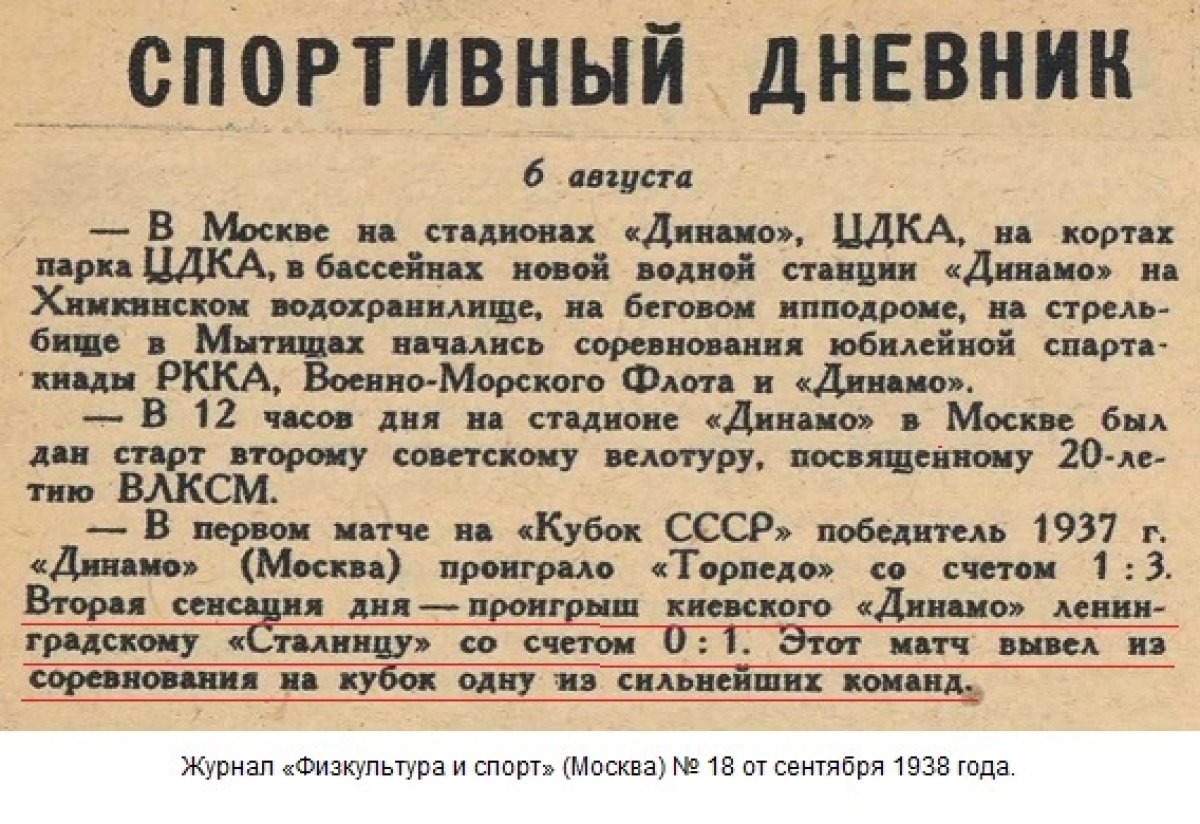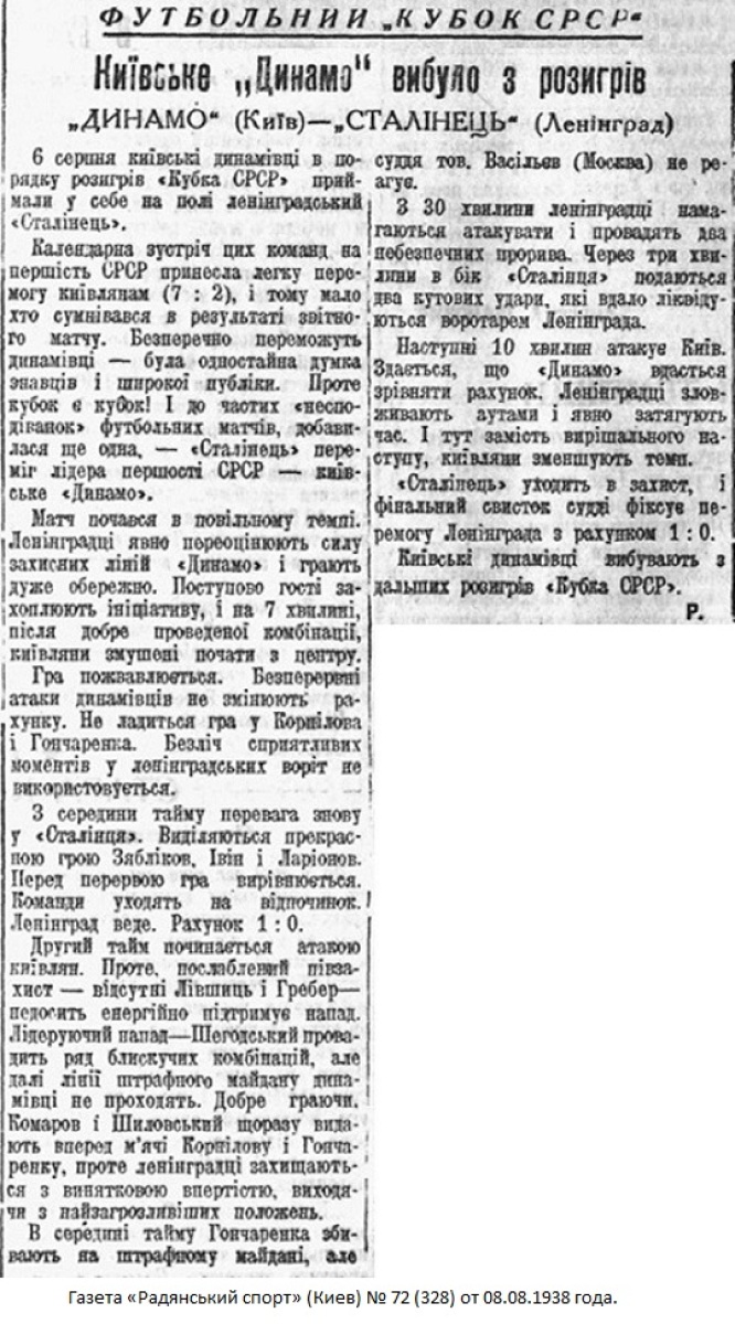 6 августа на киевском стадионе «Динамо» им. Ежова состоялся футбольный матч на кубок СССР между командами мастеров «Сталинец» (Ленинград) и «Динамо» (Киев).