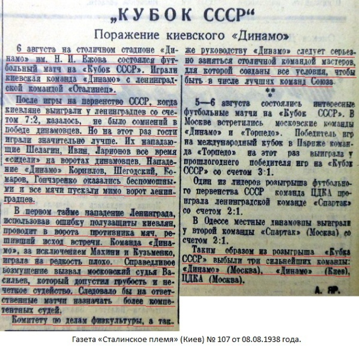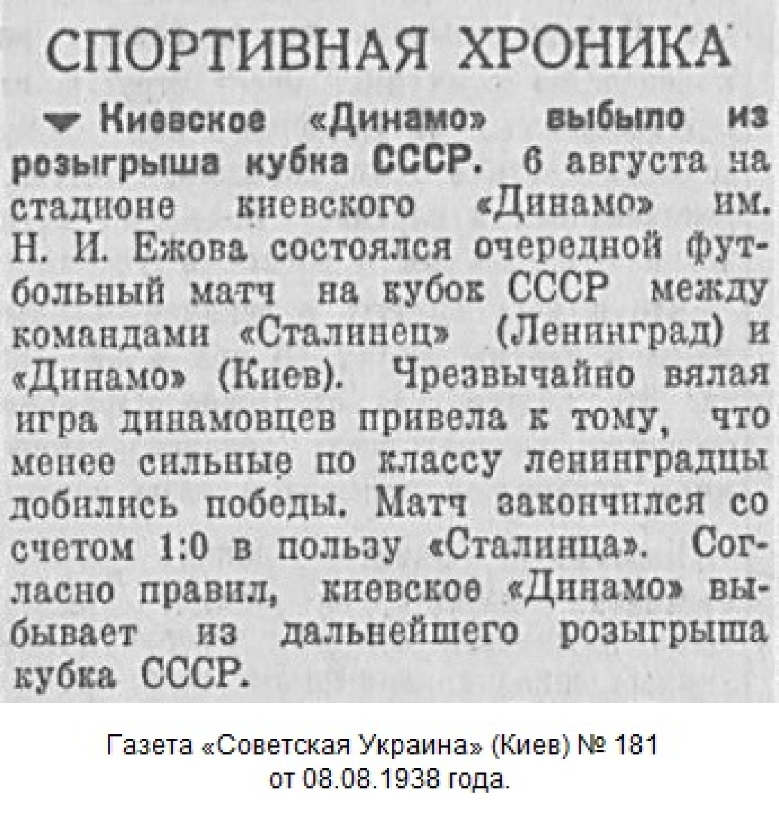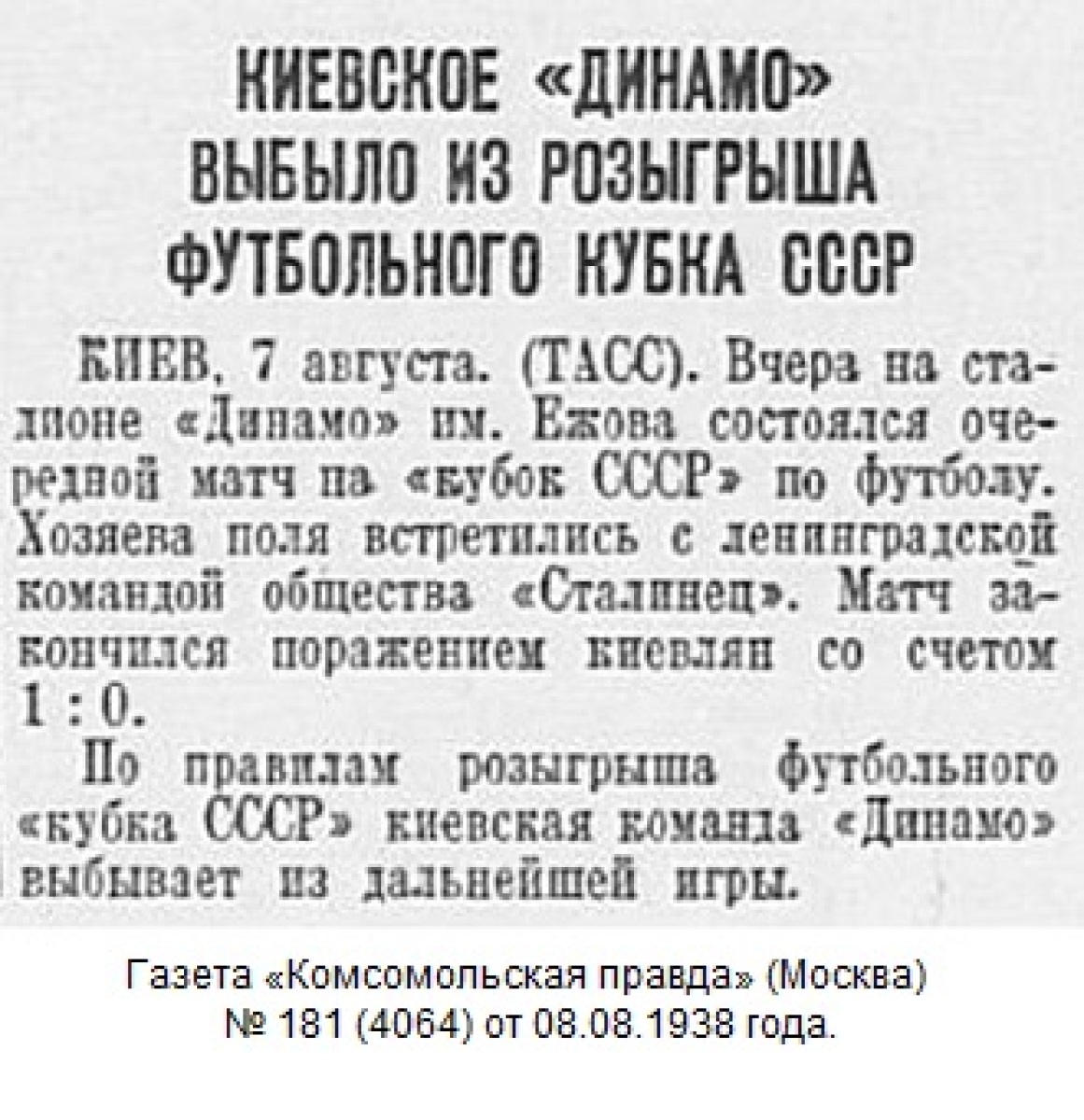 6 августа на киевском стадионе «Динамо» им. Ежова состоялся футбольный матч на кубок СССР между командами мастеров «Сталинец» (Ленинград) и «Динамо» (Киев).