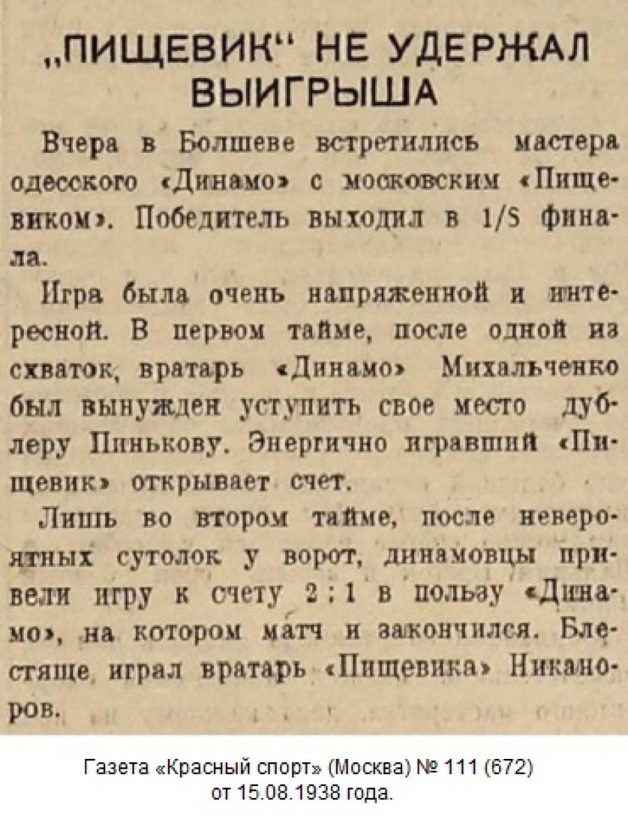 Выезд на игру в Болшево, где принимал своих соперников московский «Пищевик», получился для «Динамо» (Одесса) удачным. Во втором тайме отличились приглашенный из Николаева Ищенко и Иван Борисевич.