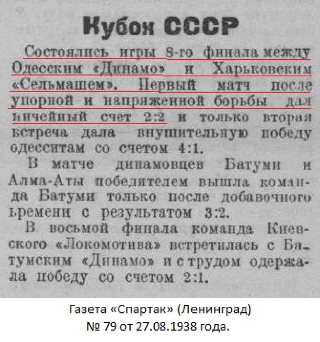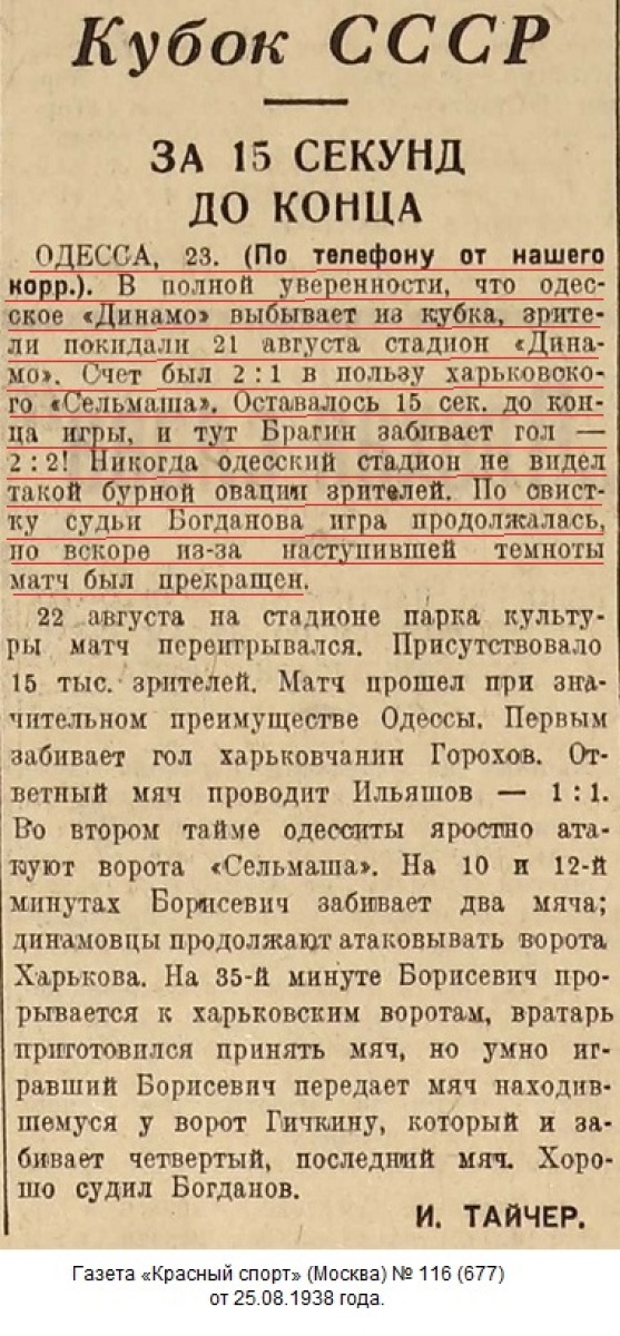 Иосиф (Юзеф) Сосицкий открыл счет в матче, но еще до перерыва харьковчане, забив два мяча (второй с пенальти), вышли вперед. Отыграться динамовцы смогли лишь на последних секундах второго тайма: после удара Александра Брагина мяч, задев Михаила Малхасова, попал в сетку ворот «Сельмаша». Добавочное время доиграть до конца не удалось из-за наступившей темноты.