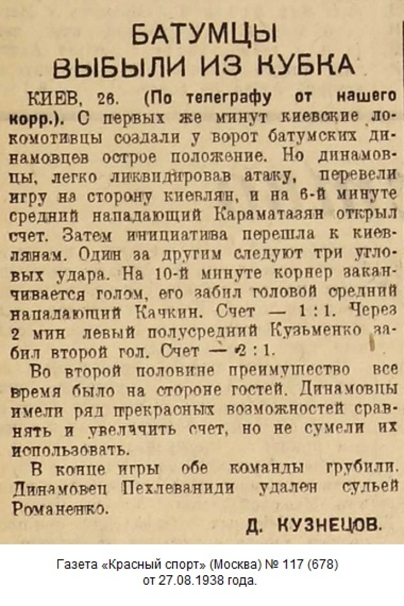 В последние 10 минут игра становится резкой. Батумцы, желая, во что бы то ни было отыграться, прибегают к грубости. Однако киевляне спокойно ликвидируют атаки противника, и матч заканчивается победой «Локомотива» – 2:1. Киевляне вышли в четверть финала «кубка СССР».