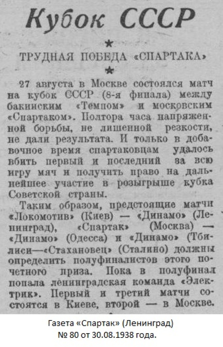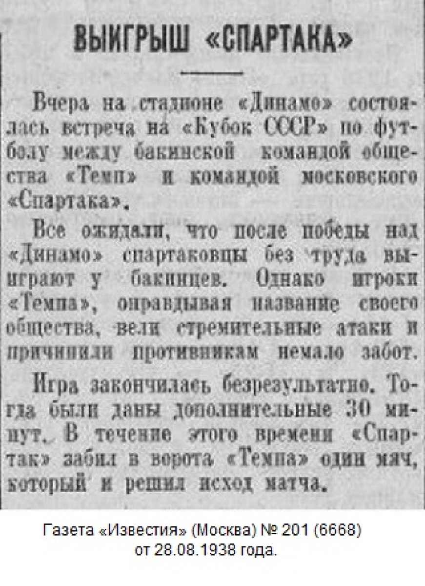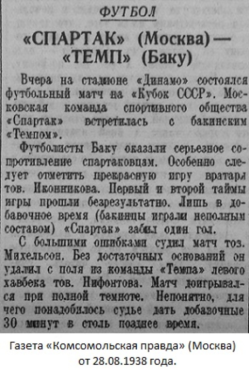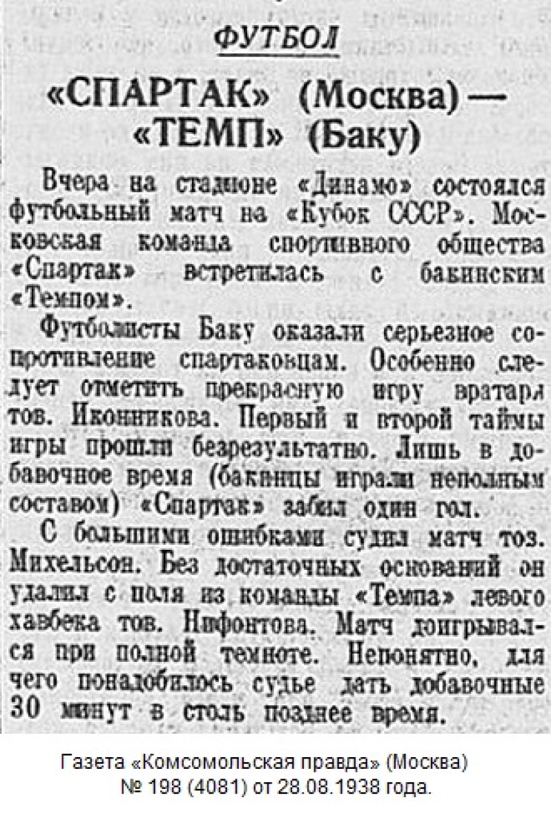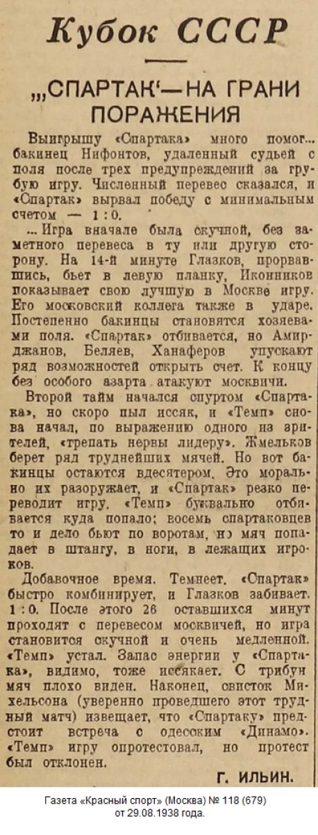 Неожиданным, не по исходу – по счету, оказался матч московского «Спартака» с бакинцами. Недавняя разгромная победа спартаковцев над «Темпом» (5:1) в чемпионате, продолжая греть их души, размягчила тела. Ничего не мог экс-чемпион противопоставить энергии и напору бакинцев. Благодарить за сохранность своих ворот он должен исключительно вратаря Владислава Жмелькова, отразившего, по утверждению «Красного спорта», ряд труднейших мячей. Подвел гостей их полузащитник Нифонтов. Играл неплохо, только очень резко, соперников не щадил. Получив от ленинградского арбитра Михельсона три предупреждения, не успокоился. Исчерпав запас воспитательных средств и терпения, судья удалил Нифонтова с поля. Играть оставалось чуть больше десяти минут. Получив численный перевес, «Спартак» пошел в атаку. По утверждению очевидцев в обстреле бакинских ворот участвовали восемь футболистов – все, кроме Жмелькова и двух защитников, Виктора и Василия Соколовых. Прижатые к пограничной черте, гости отбивались, как могли. Москвичам фатально не везло. Мячи утыкались в штангу, застревали в частоколе ног, попадали в беспомощно лежавшего на земле вратаря Иконникова... Кошмар продолжался и в дополнительное время. До тех пор, пока Глазков не распечатал заколдованные кем-то ворота гостей. Игра потеряла интерес (в отличие от прошлых лет в дополнительной 30-минутке игра с забитым голом не прекращалась). Гости, похоже, не верили в возможность сравнять счет. Да и сил осталось маловато. «Спартак», умиротворенный достигнутым, осаду снял. «Темп» опротестовал игру и получил отказ.