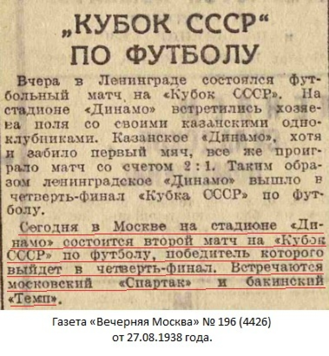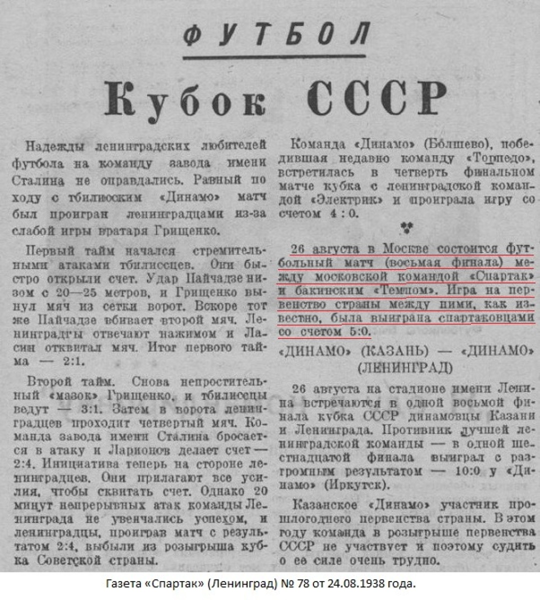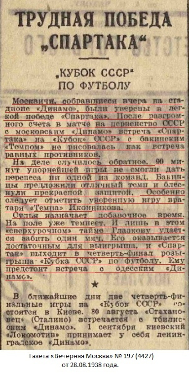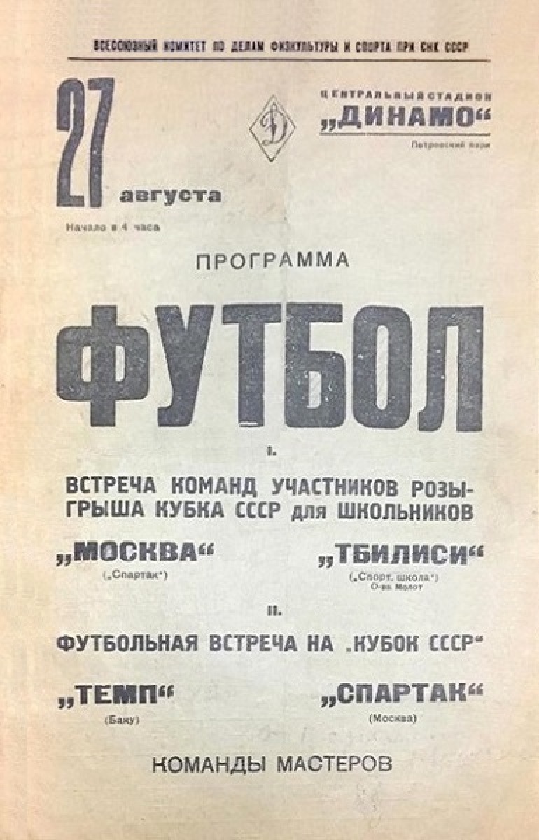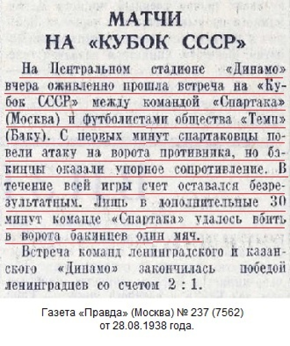 Неожиданным, не по исходу – по счету, оказался матч московского «Спартака» с бакинцами. Недавняя разгромная победа спартаковцев над «Темпом» (5:1) в чемпионате, продолжая греть их души, размягчила тела. Ничего не мог экс-чемпион противопоставить энергии и напору бакинцев. Благодарить за сохранность своих ворот он должен исключительно вратаря Владислава Жмелькова, отразившего, по утверждению «Красного спорта», ряд труднейших мячей. Подвел гостей их полузащитник Нифонтов. Играл неплохо, только очень резко, соперников не щадил. Получив от ленинградского арбитра Михельсона три предупреждения, не успокоился. Исчерпав запас воспитательных средств и терпения, судья удалил Нифонтова с поля. Играть оставалось чуть больше десяти минут. Получив численный перевес, «Спартак» пошел в атаку. По утверждению очевидцев в обстреле бакинских ворот участвовали восемь футболистов – все, кроме Жмелькова и двух защитников, Виктора и Василия Соколовых. Прижатые к пограничной черте, гости отбивались, как могли. Москвичам фатально не везло. Мячи утыкались в штангу, застревали в частоколе ног, попадали в беспомощно лежавшего на земле вратаря Иконникова... Кошмар продолжался и в дополнительное время. До тех пор, пока Глазков не распечатал заколдованные кем-то ворота гостей. Игра потеряла интерес (в отличие от прошлых лет в дополнительной 30-минутке игра с забитым голом не прекращалась). Гости, похоже, не верили в возможность сравнять счет. Да и сил осталось маловато. «Спартак», умиротворенный достигнутым, осаду снял. «Темп» опротестовал игру и получил отказ.