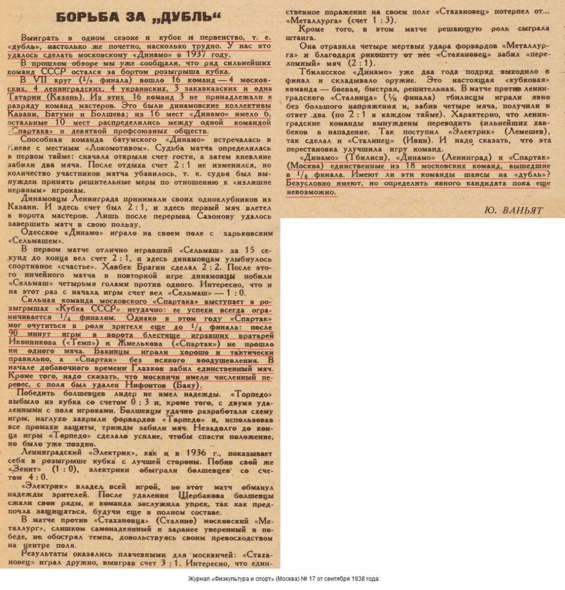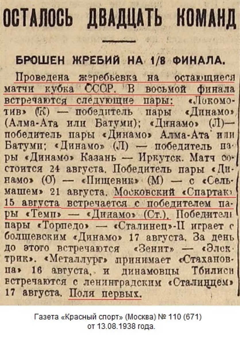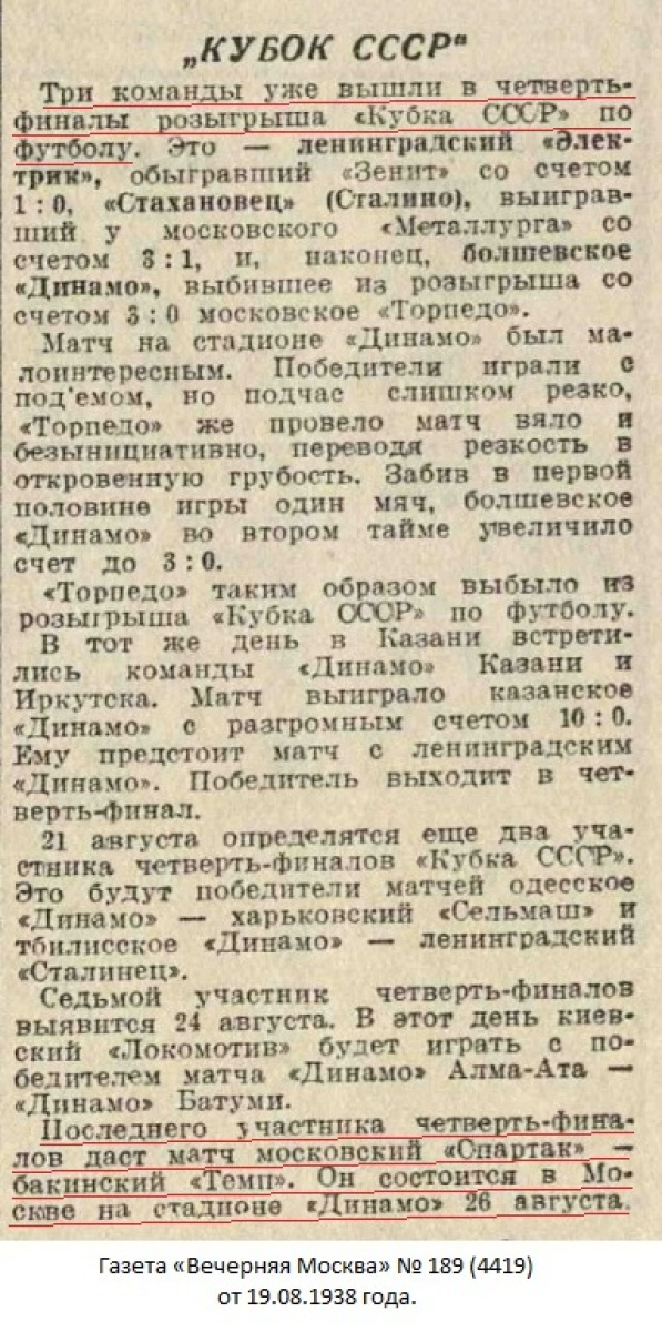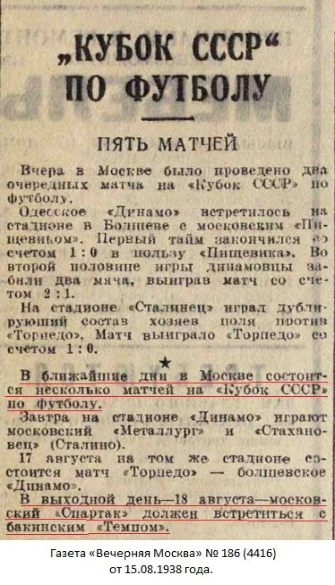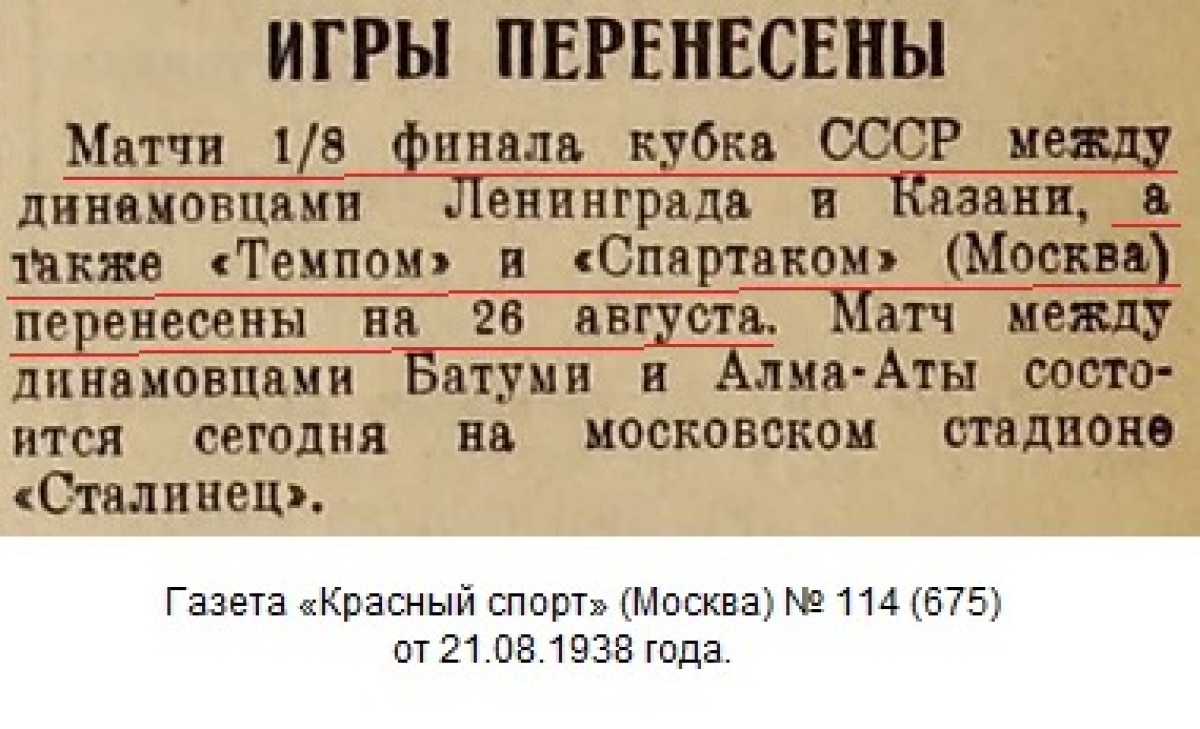 Неожиданным, не по исходу – по счету, оказался матч московского «Спартака» с бакинцами. Недавняя разгромная победа спартаковцев над «Темпом» (5:1) в чемпионате, продолжая греть их души, размягчила тела. Ничего не мог экс-чемпион противопоставить энергии и напору бакинцев. Благодарить за сохранность своих ворот он должен исключительно вратаря Владислава Жмелькова, отразившего, по утверждению «Красного спорта», ряд труднейших мячей. Подвел гостей их полузащитник Нифонтов. Играл неплохо, только очень резко, соперников не щадил. Получив от ленинградского арбитра Михельсона три предупреждения, не успокоился. Исчерпав запас воспитательных средств и терпения, судья удалил Нифонтова с поля. Играть оставалось чуть больше десяти минут. Получив численный перевес, «Спартак» пошел в атаку. По утверждению очевидцев в обстреле бакинских ворот участвовали восемь футболистов – все, кроме Жмелькова и двух защитников, Виктора и Василия Соколовых. Прижатые к пограничной черте, гости отбивались, как могли. Москвичам фатально не везло. Мячи утыкались в штангу, застревали в частоколе ног, попадали в беспомощно лежавшего на земле вратаря Иконникова... Кошмар продолжался и в дополнительное время. До тех пор, пока Глазков не распечатал заколдованные кем-то ворота гостей. Игра потеряла интерес (в отличие от прошлых лет в дополнительной 30-минутке игра с забитым голом не прекращалась). Гости, похоже, не верили в возможность сравнять счет. Да и сил осталось маловато. «Спартак», умиротворенный достигнутым, осаду снял. «Темп» опротестовал игру и получил отказ.