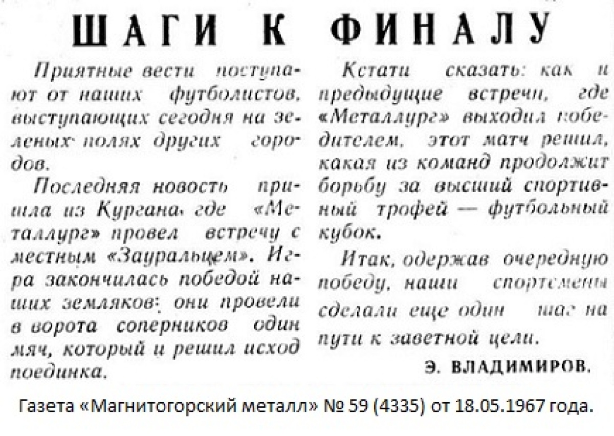 ШАГИ К ФИНАЛУ\r\nПриятные вести поступают от наших футболистов, выступающих сегодня ни зеленых полях других городов. Последняя новость пришла из Кургана, где «Металлург» провел встречу с местным «Зауральцем». Игра закончилась победой наших земляков - они провели в ворота соперников один мяч, который и решил исход поединка. Кстати сказать: как и предыдущие встречи, где «Металлург» выходил победителем, этот матч решил, какая из команд продолжит борьбу за высший спортивный трофей — футбольный кубок. Итак, одержав очередную победу, наши спортсмены сделали еще один шаг на пути к заветной цели. \r\nЭ. ВЛАДИМИРОВ\r\nГазета \"Магнитогорский металл\" от 18.05.1967 г.\r\n\r\n11 мая в Кургане был проведен матч на Кубок СССР. Наши футболисты проиграли встречу магнитогорскому \"Металлургу\" - 0:1 и выбыли из дальнейшего розыгрыша.\r\nК/С Курган-87. Составитель Паниковский В.