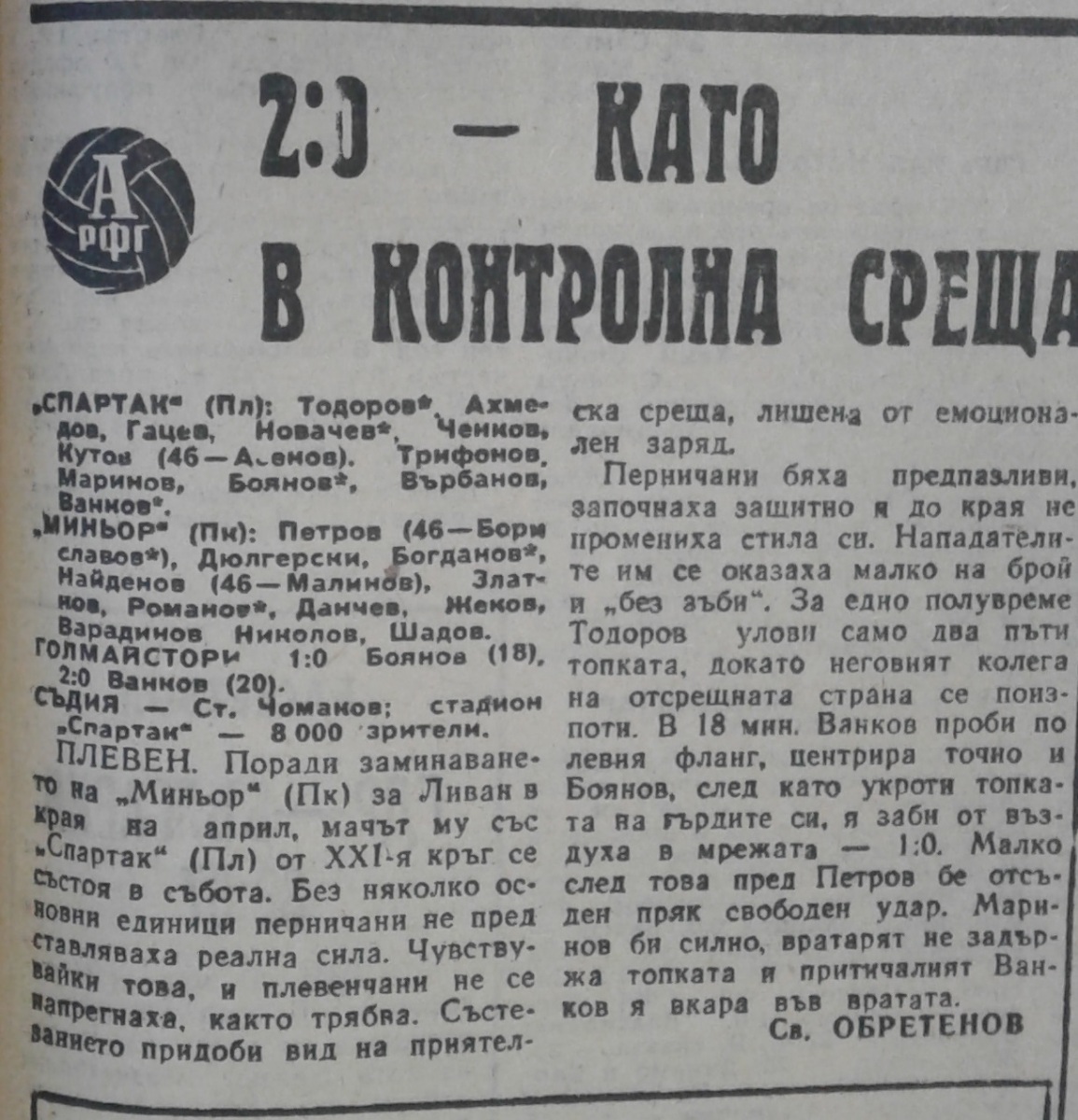 «Спартак» Плевен - «Минёр» Перник - 2:0