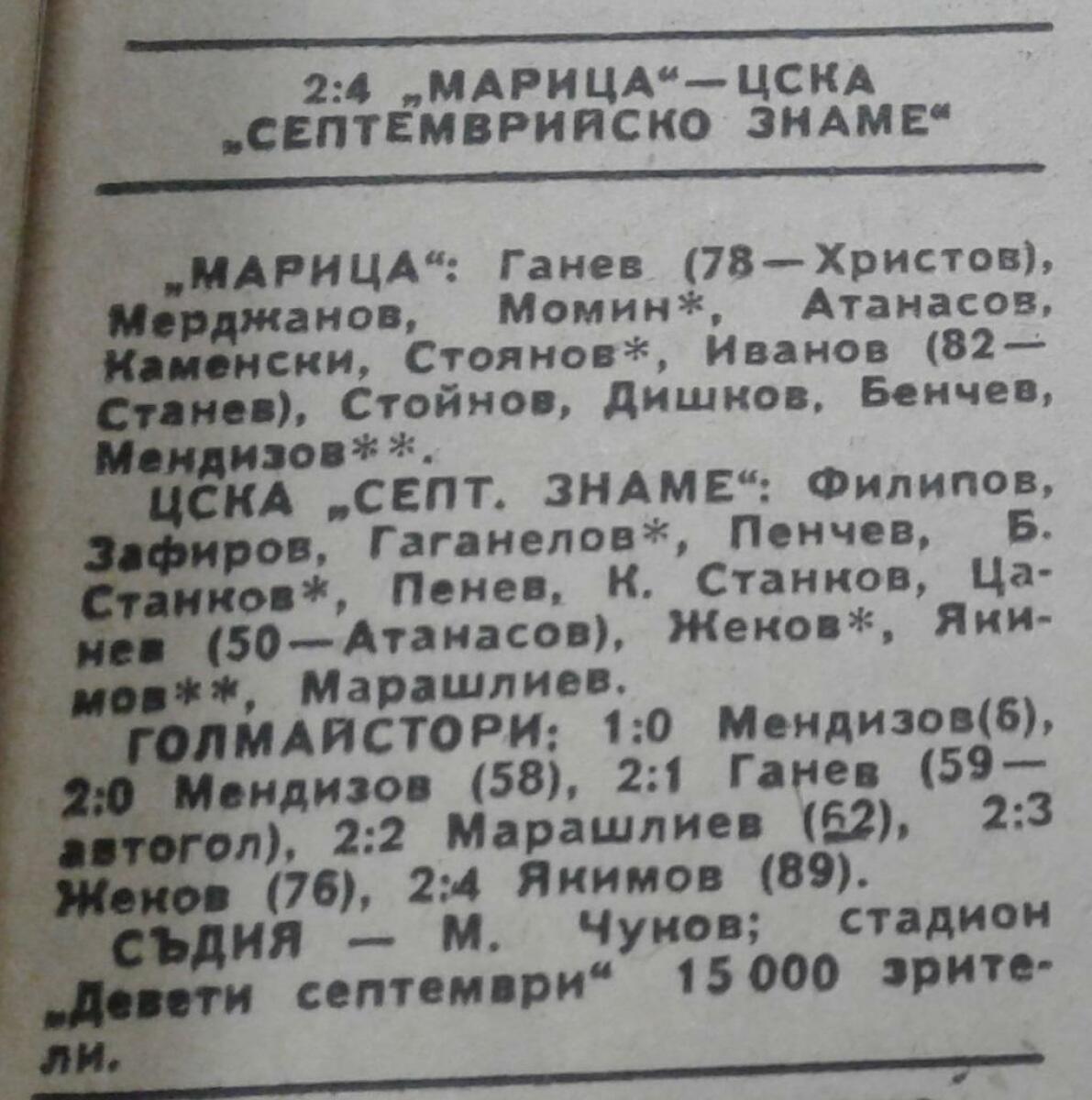 «Марица» Пловдив - «ЦСКА Септемврийско Знаме» София - 2:4