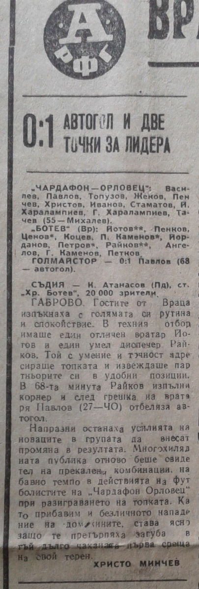 «Чардафон-Орловец» Габрово - «Ботев» Враца - 0:1
