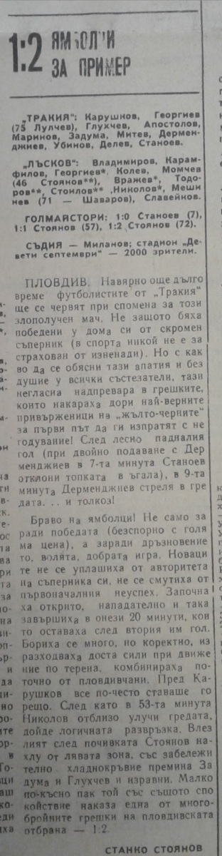 «Тракия» Пловдив - «Николай Лысков» Ямбол - 1:2