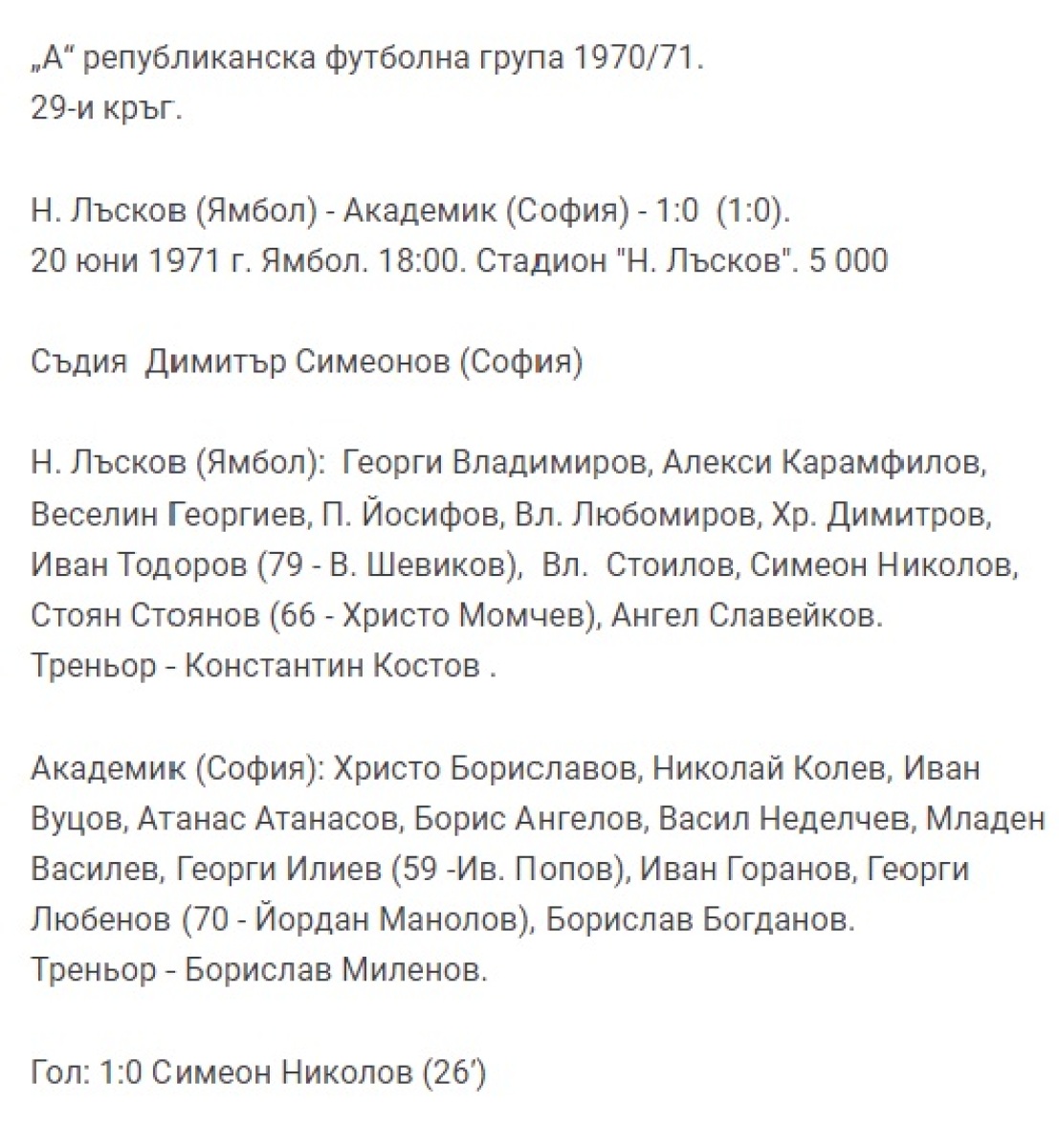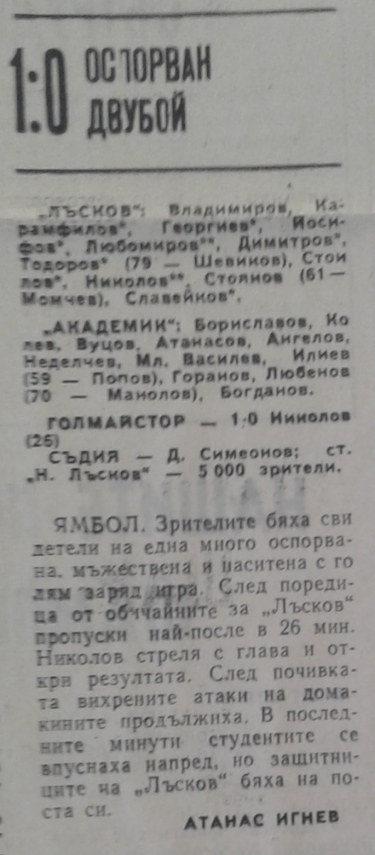 «Николай Лысков» Ямбол - «Академик» София - 1:0