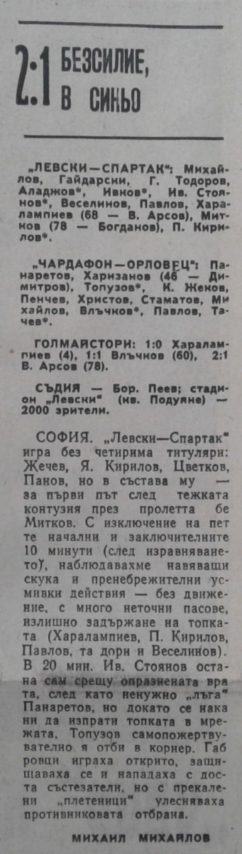 «Левски-Спартак» София - «Чардафон-Орловец» Габрово - 2:1