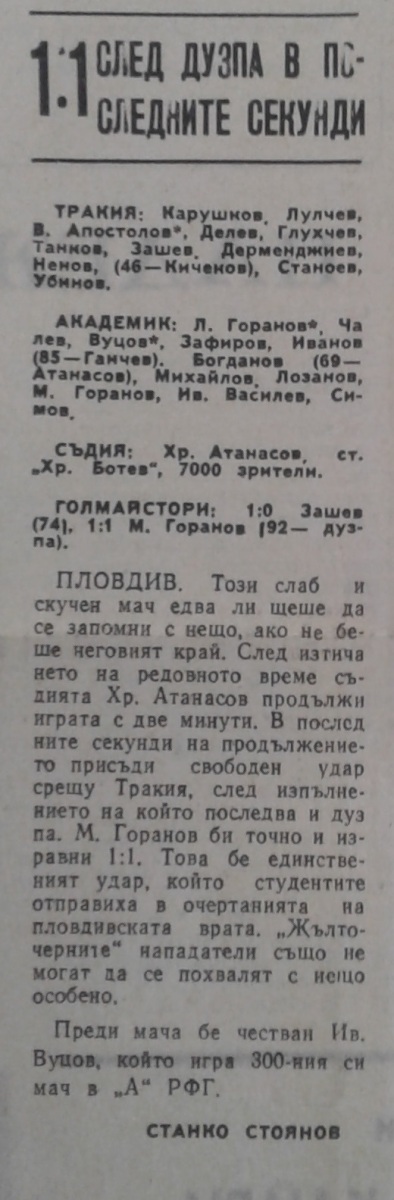 Иван Вуцов (Академик София) провёл свой 300-й матч в А РФГ (20 - Ботев Пловдив, 210 - Левски София и 70 Академик София). Добрин Ненов (Тракия Пловдив) провёл свой 200-й матч в А РФГ. Иван Киченов (Тракия Пловдив) дебютировл в А РФГ (из Партизанин (Пръвомай))