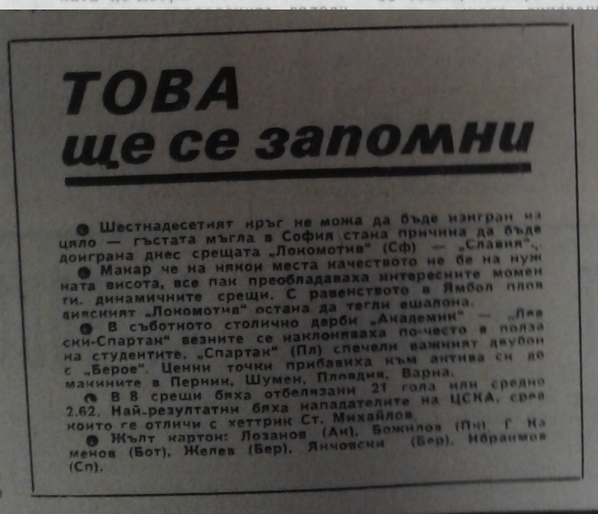 Этот матч продолжался два дня. 10 декабря судья Гочо Русев из-за густого тумана остановил матч на 11-й минуте. На следующий день были доиграны остальные 79 минут матча. Из-за того что Гочо Русев был в составе судейской тройки в матче кубка УЕФА (13.12.1972) Ливерпуль - Динамо Берлин доигровку судил Никола Дудин.