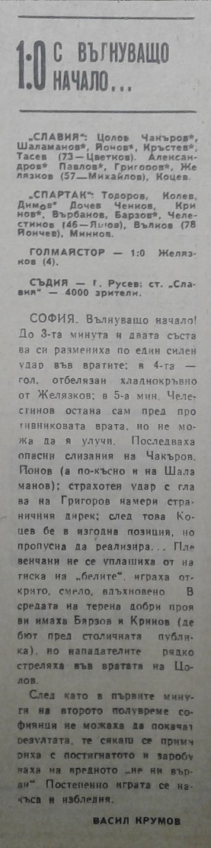 Любен Тасев (Славия София) провёл свой 200-й матч в А РФГ. Стоян Коцев (Славия София) провёл свой 150-й матч в А РФГ.