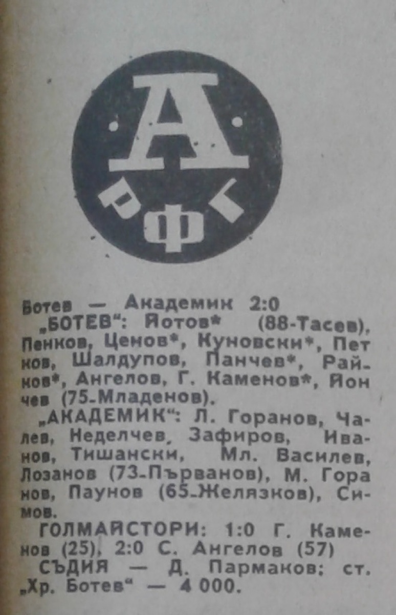 Емил Младенов (Берое) дебютировал в А РФГ (из юношеской команды). Георги Панчев (Берое) дебютировал в А РФГ (из Септ..слава Михайловград). Живко Желязков (Академик София) дебютировал в А РФГ (из Добруджа Толбухин).