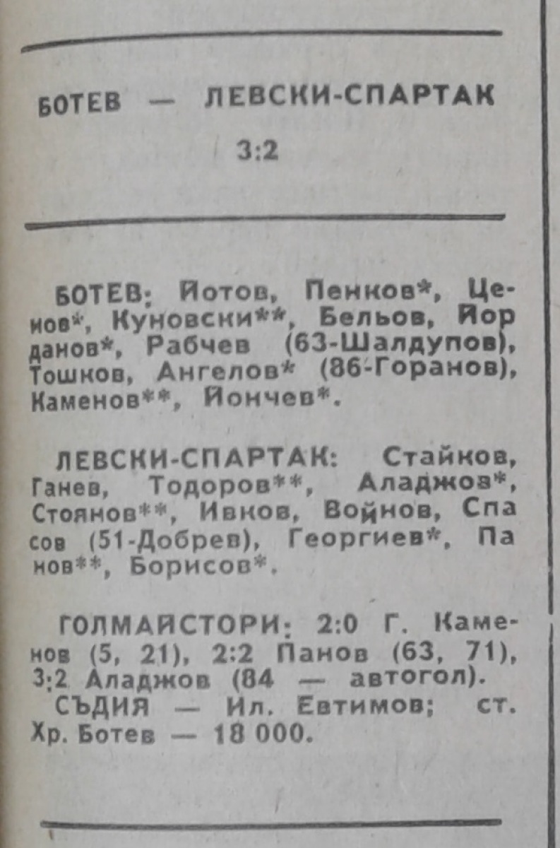 Георги Каменов (Ботев Враца) забил свой 150-й гол в А РФГ. Ролан Георгиев (Левски-Спартак) дебютировал в А РФГ (из юнош. команды).