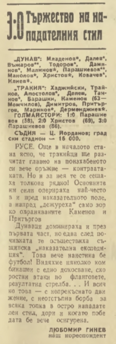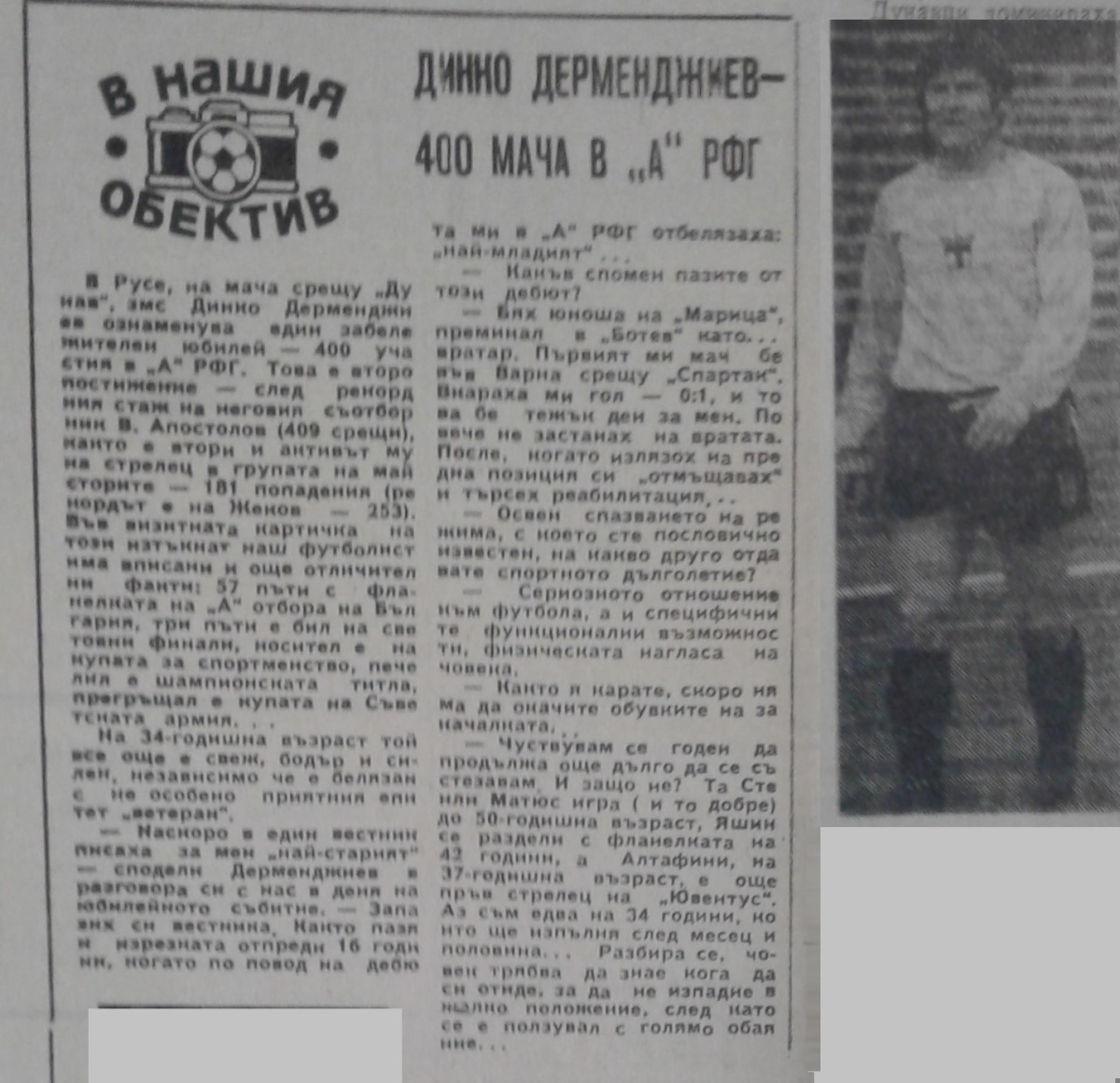 Динко Дерменджиев (Тракия Пловдив) провёл свой 400-й матч в А РФГ (дебют в А РФГ 15.11.1959 в матче Спартак Варна - Ботев Пловдив - 1:0)